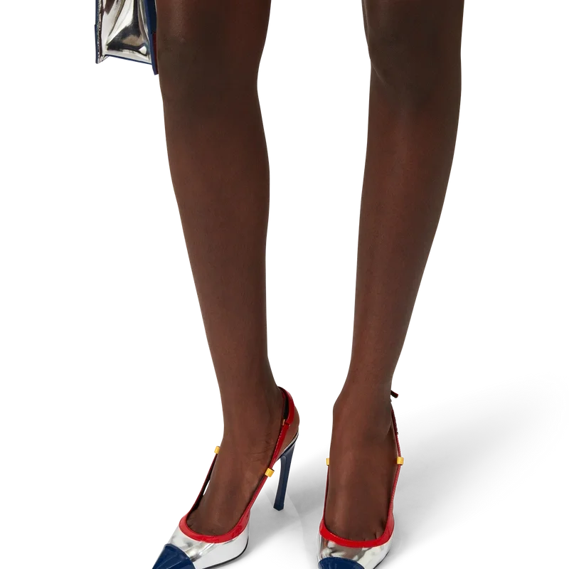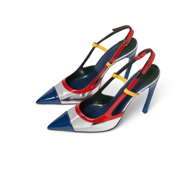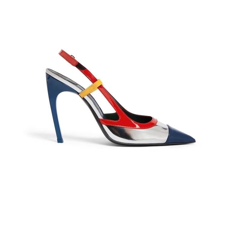 Die Chrome Arch Slingbacks sind Pumps im Stiletto-Stil mit Obermaterial aus mehrfarbigem Lackkalbsleder. Abgerundet durch rotes, gelbes und chromfarbenes Leder, blaue Stiletto-Absätze, Fersenriemen und Ledersohlen.