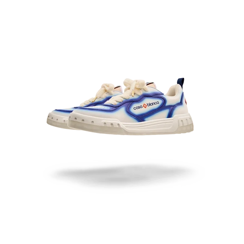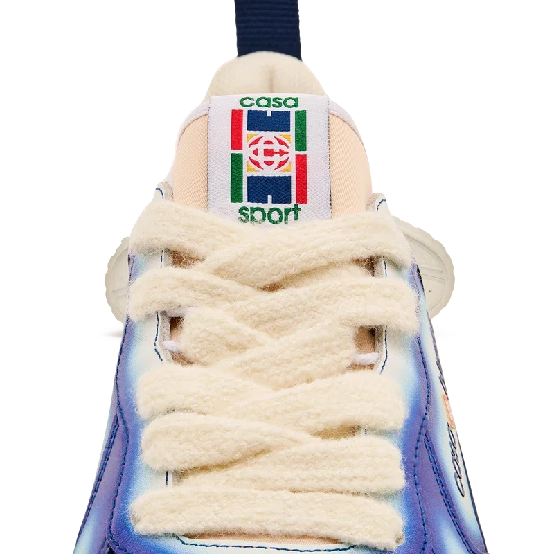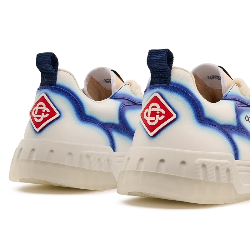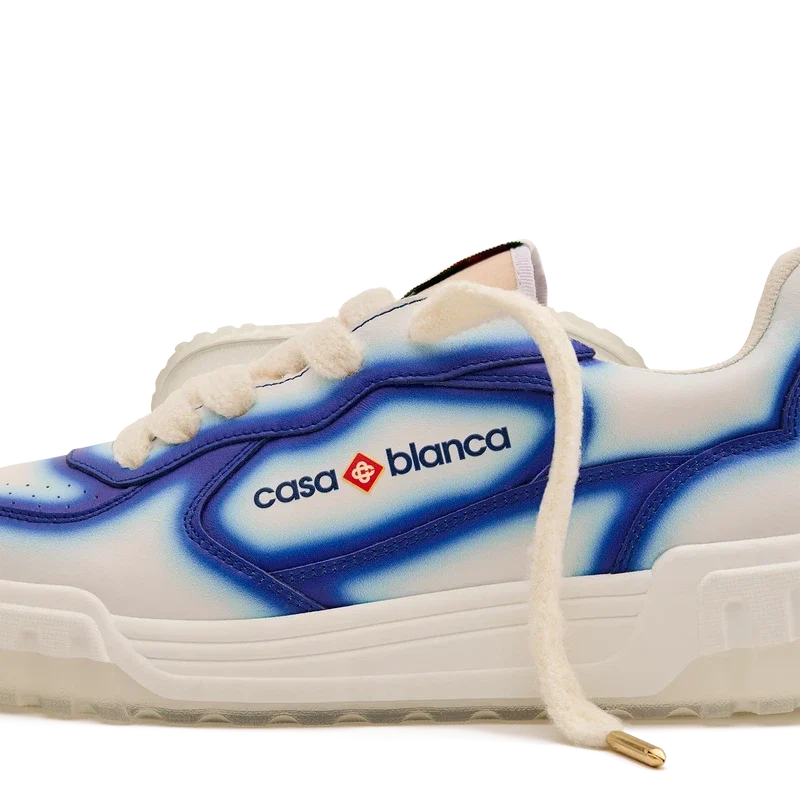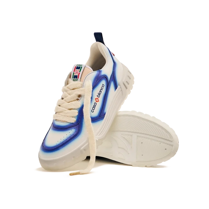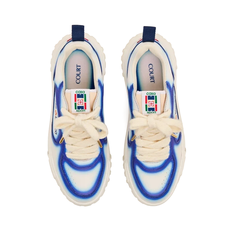 Die Designsprache des Court Sneakers spiegelt die ikonischen Silhouetten der 90er Jahre wider. Die Farben der Gummisohle sind eine Kombination aus den raffinierten Codes des Tennissports und der klassischen Architektur und schaffen eine einheitliche Farbpalette für den gesamten Schuh, wobei der Fokus auf Primärfarben liegt, die durch Tennisweiß abgesetzt werden, um eine sportliche Farbgeschichte zu schaffen. Das Obermaterial der Schuhe weist integrierte, fließende Panel-Linien auf, die an die ikonischen Silhouetten der 90er Jahre anknüpfen. Das markante Casablanca-Branding ist durchgehend sichtbar, einschließlich des charakteristischen Diamantmotivs der Marke an der Ferse, der seitlichen Silikon-Wordmark-Einsätze sowie des gewebten Zungenlabels und der Einlegesohle mit Tennisplatz-Motiv, die dem Schuh seinen Namen „Court“ geben.