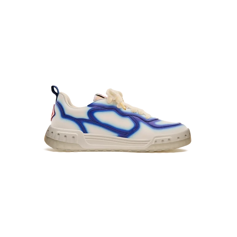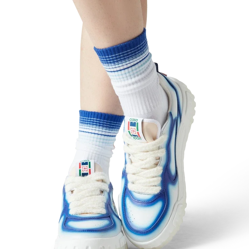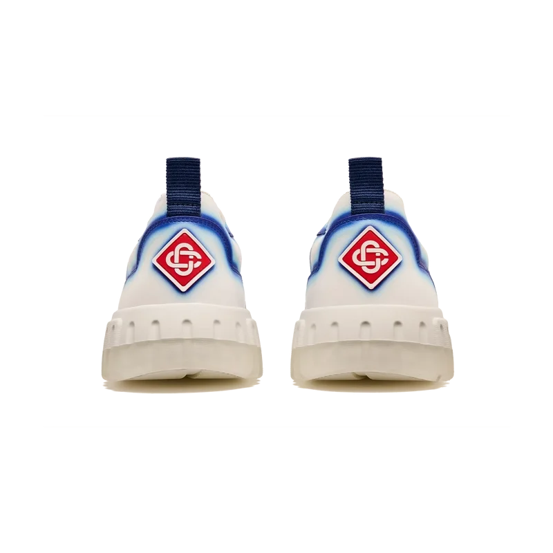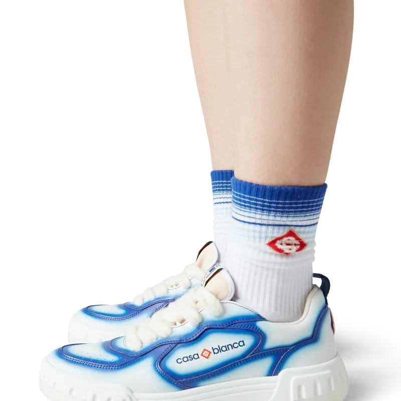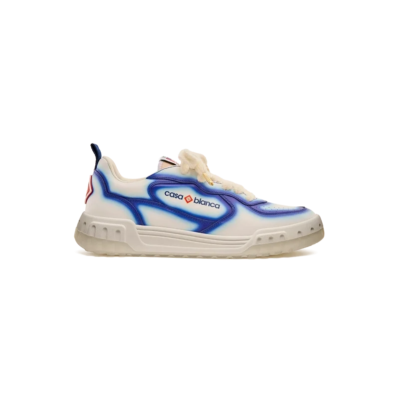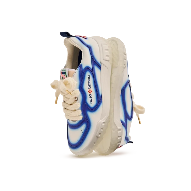Die Designsprache des Court Sneakers spiegelt die ikonischen Silhouetten der 90er Jahre wider. Die Farben der Gummisohle sind eine Kombination aus den raffinierten Codes des Tennissports und der klassischen Architektur und schaffen eine einheitliche Farbpalette für den gesamten Schuh, wobei der Fokus auf Primärfarben liegt, die durch Tennisweiß abgesetzt werden, um eine sportliche Farbgeschichte zu schaffen. Das Obermaterial der Schuhe weist integrierte, fließende Panel-Linien auf, die an die ikonischen Silhouetten der 90er Jahre anknüpfen. Das markante Casablanca-Branding ist durchgehend sichtbar, einschließlich des charakteristischen Diamantmotivs der Marke an der Ferse, der seitlichen Silikon-Wordmark-Einsätze sowie des gewebten Zungenlabels und der Einlegesohle mit Tennisplatz-Motiv, die dem Schuh seinen Namen „Court“ geben.