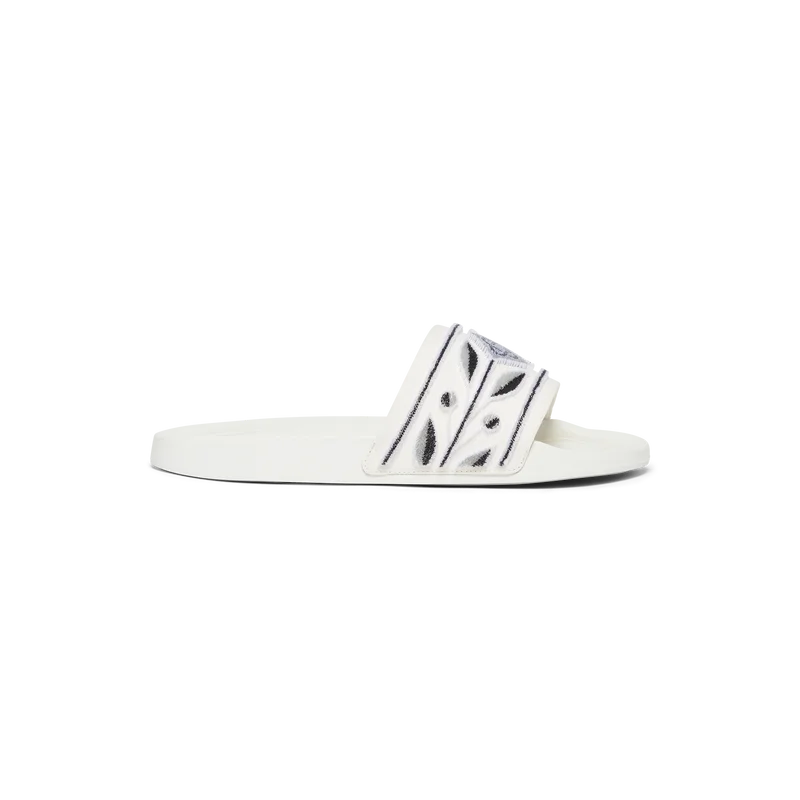 Die Pool-Slides sind aus besticktem Frottee gefertigt und zieren auf dem Obermaterial das Diamant-Logo des Hauses sowie das charakteristische Lorbeer-Motiv. Abgerundet werden sie durch ein geformtes Fußbett für erhöhten Komfort und eine strukturierte, gummierte Sohle, die Funktionalität mit Freizeitlook verbindet.