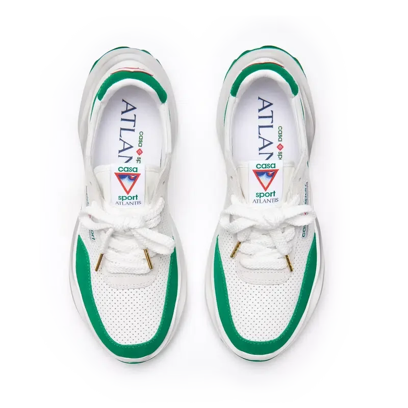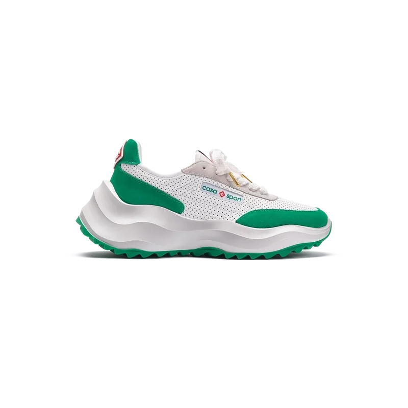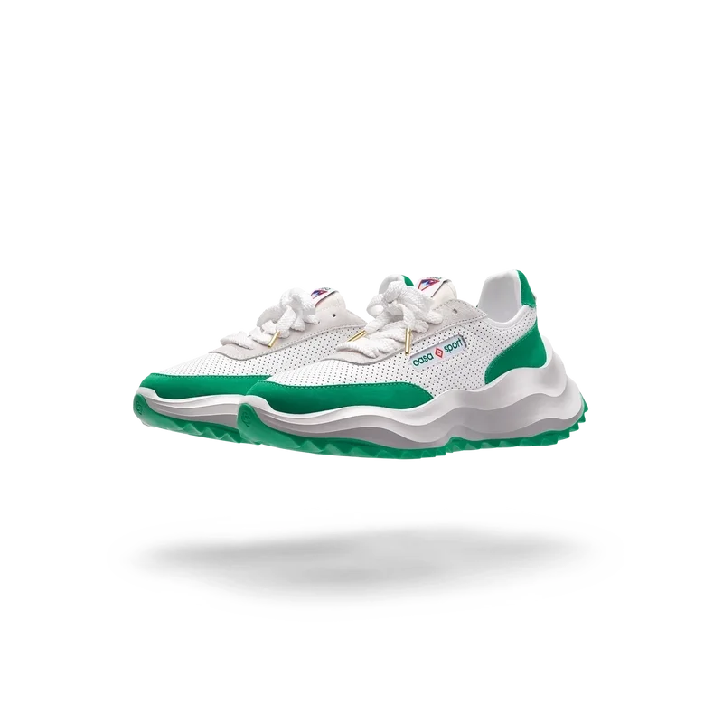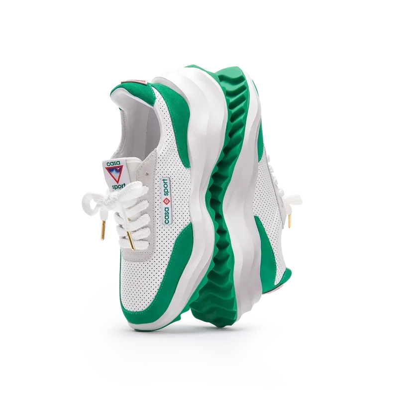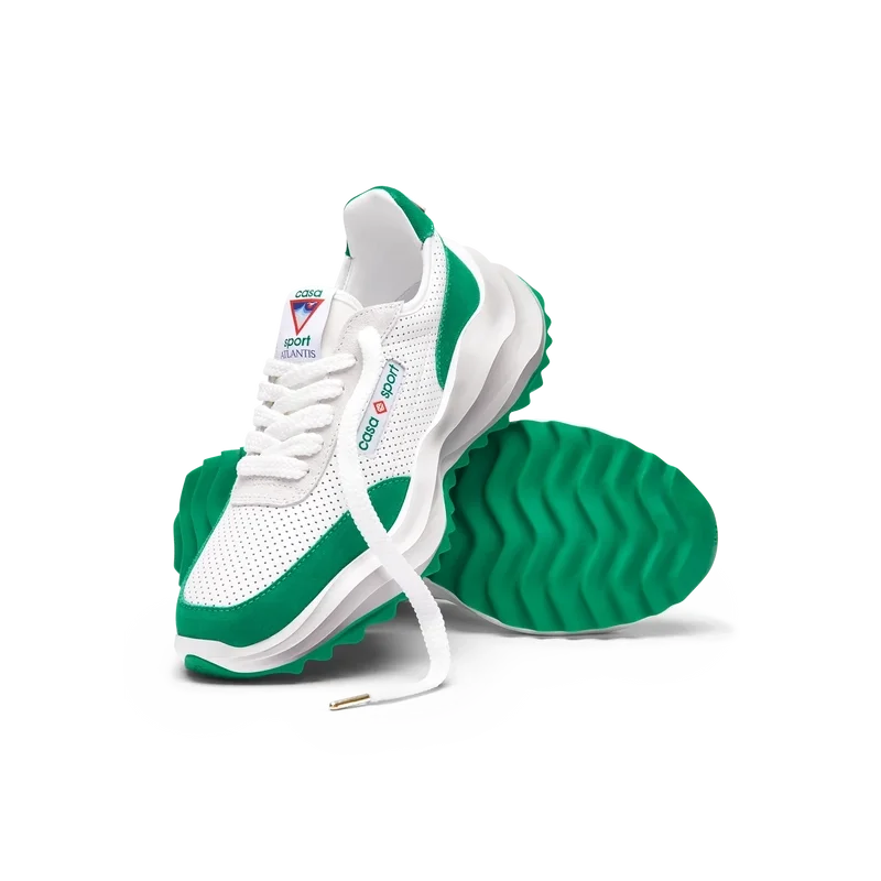 Ton-in-Ton-GrünOverlays aus Wildleder, Obermaterial aus perforiertem Leder, kontrastierende Schnürsenkel aus Wildleder, Casablanca-Diamant-Gummipatch mit Markenlogo an der Fersenlasche, gewebte Casa Sport-Fensterlasche mit Markenlogo an der Seitenwand, gewebtes Atlantis-Zungenlabel, geformte EVA-Wave-Zwischensohle, Gummi-Außensohle, goldene Schnürsenkelenden