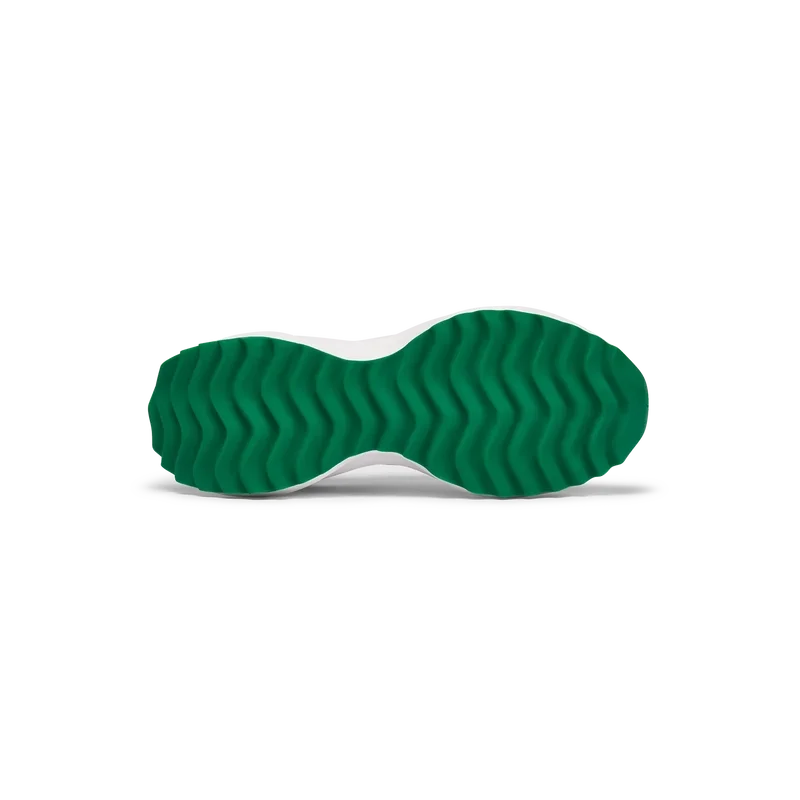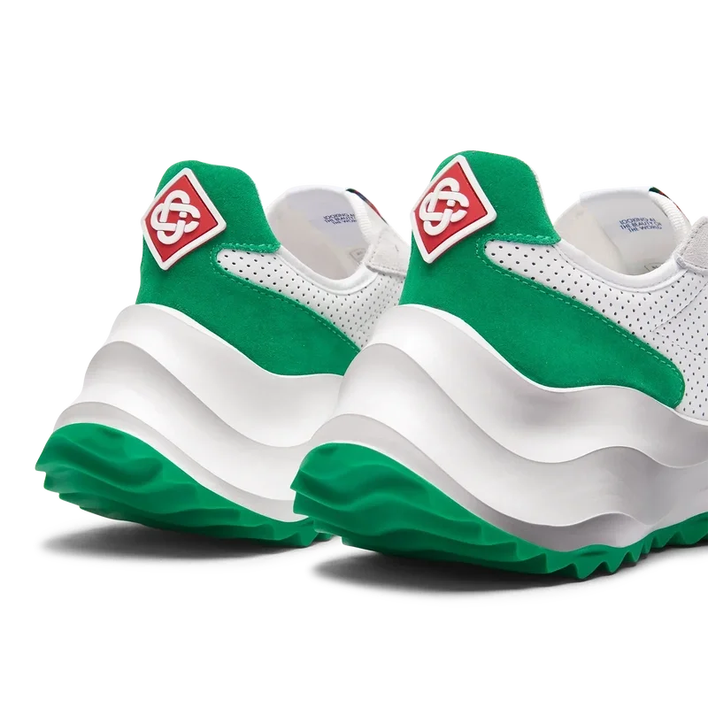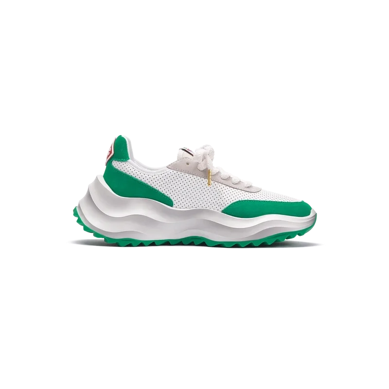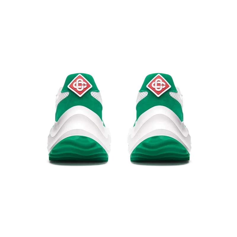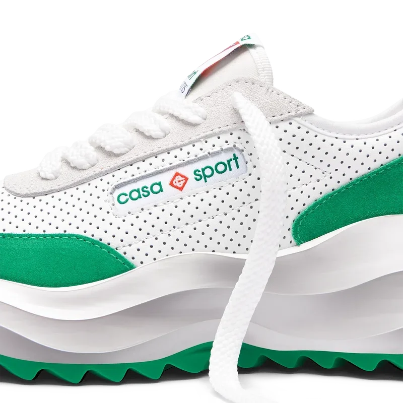 Ton-in-Ton-GrünOverlays aus Wildleder, Obermaterial aus perforiertem Leder, kontrastierende Schnürsenkel aus Wildleder, Casablanca-Diamant-Gummipatch mit Markenlogo an der Fersenlasche, gewebte Casa Sport-Fensterlasche mit Markenlogo an der Seitenwand, gewebtes Atlantis-Zungenlabel, geformte EVA-Wave-Zwischensohle, Gummi-Außensohle, goldene Schnürsenkelenden