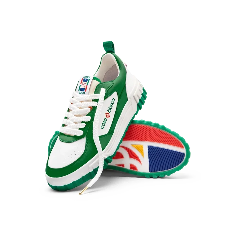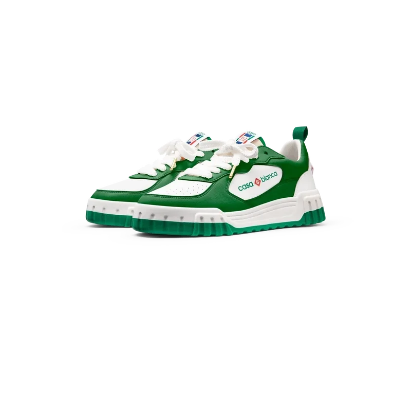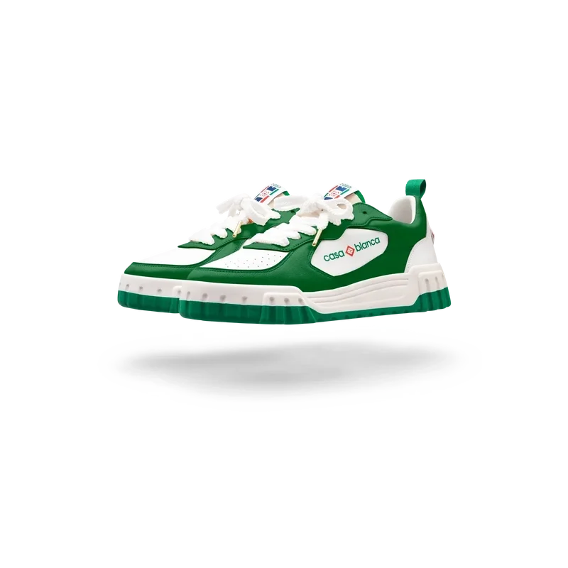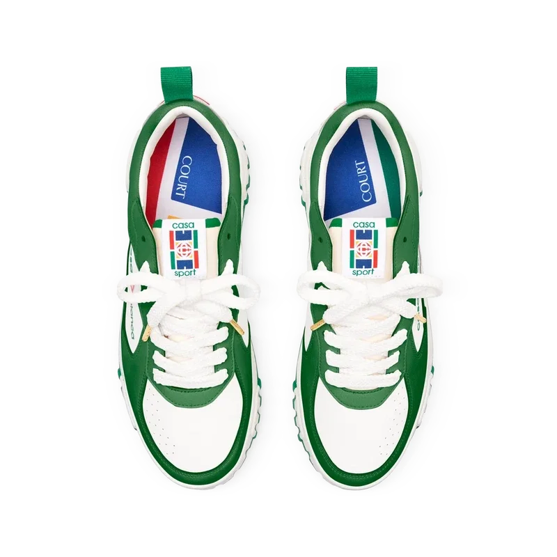 Das markante Casablanca-Branding ist überall deutlich zu erkennen, einschließlich des charakteristischen Diamantmotivs der Marke an der Ferse, des seitlichen Silikon-Wortzeichens sowie des gewebten Zungenetiketts und der Einlegesohle mit Tennisplatz-Motiv, die dem Schuh seinen Namen „The Court“ geben.