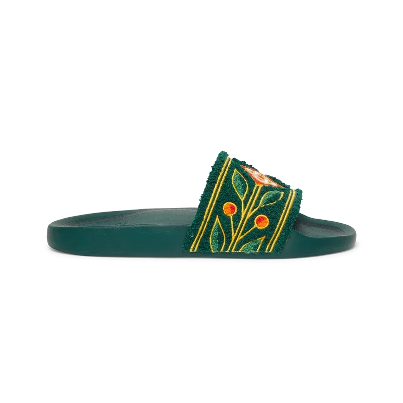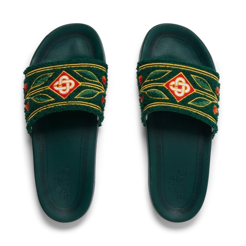 Die Laurel Terry Sliders sind aus besticktem Frottee gefertigt und zieren auf dem Obermaterial das Diamant-Logo des Hauses sowie das charakteristische Laurel-Motiv. Abgerundet werden sie durch weiche und flexible, gepolsterte, gummiartige Sohlen.