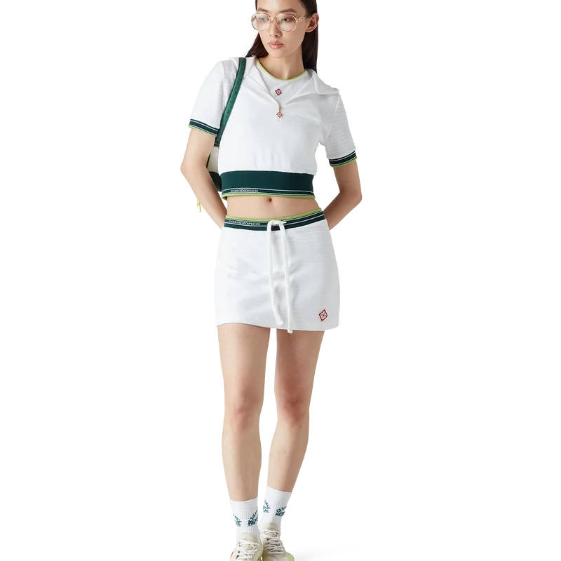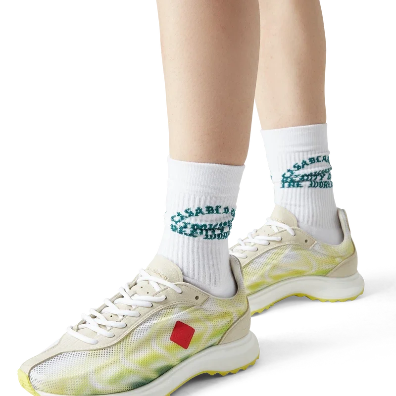 Der Damen-Sneaker „Stade Green“ hat seinen Namen von der antiken griechischen Maßeinheit für die Distanz eines Fußrennens, aus der später das Wort „Stadion“ entstand. Der Stil ist von Performance-Laufschuhen inspiriert und verkörpert die Übertragung moderner Technologie aus alter Tradition; die Merkmale des modernen Laufsports mit dem leichten Mesh und dem Glow-Print unterstreichen die Modernität. Die Sohle weist skulpturale Kurven auf, die eine Anspielung auf unseren Atlantis-Schuh und ein Markenzeichen des Casablanca-Designs sind.