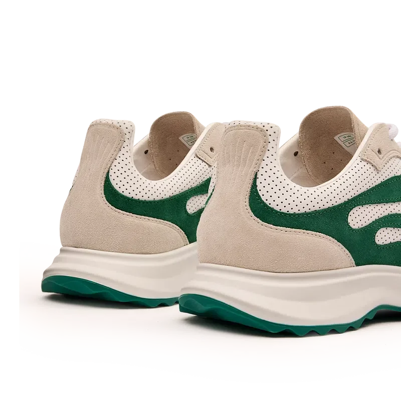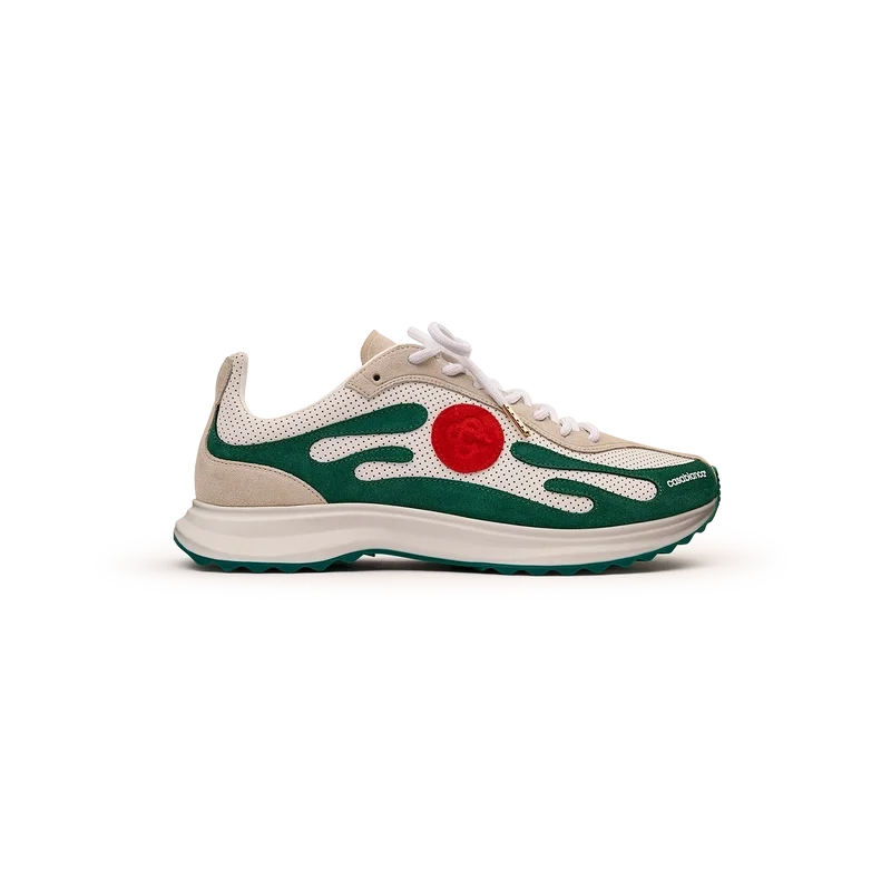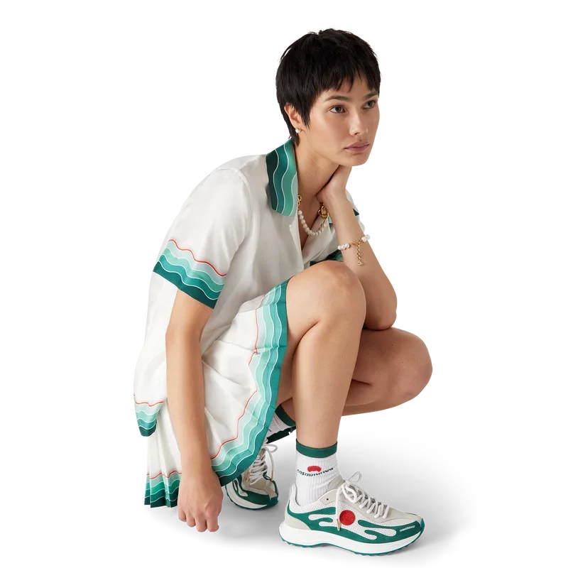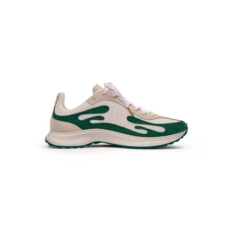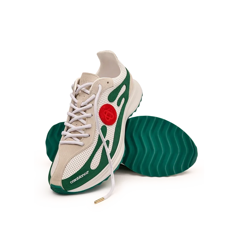 Der weiße und grüne Stade-Sneaker für Damen hat seinen Namen von der antiken griechischen Maßeinheit für die Distanz eines Fußrennens, aus der später das Wort „Stadion“ entstand. Der Stil ist von Performance-Laufschuhen inspiriert und verkörpert die Übertragung moderner Technologie aus alter Tradition; die Merkmale des modernen Laufsports mit dem leichten Mesh und dem Glow-Print tragen zur Modernität bei. Die Sohle weist skulpturale Kurven auf, die eine Anspielung auf unseren Atlantis-Schuh und ein Markenzeichen des Casablanca-Designs sind.