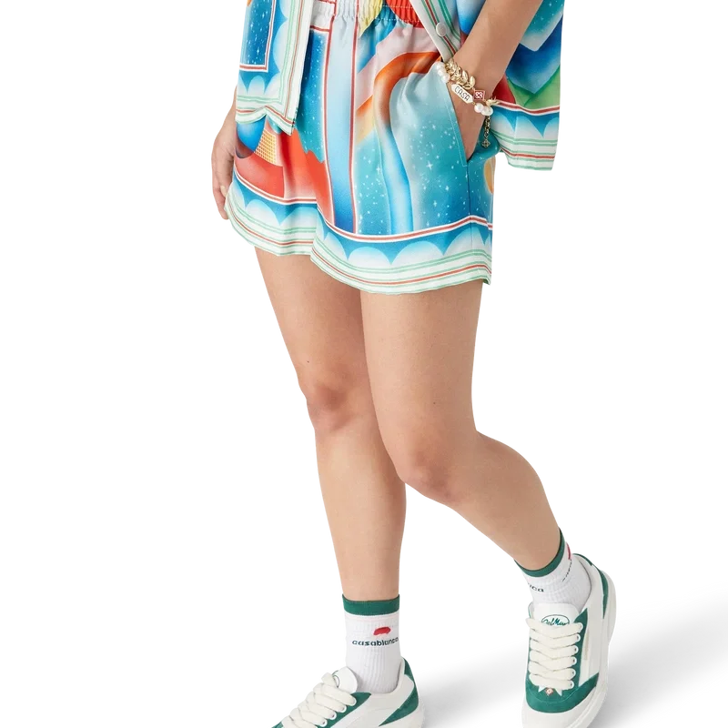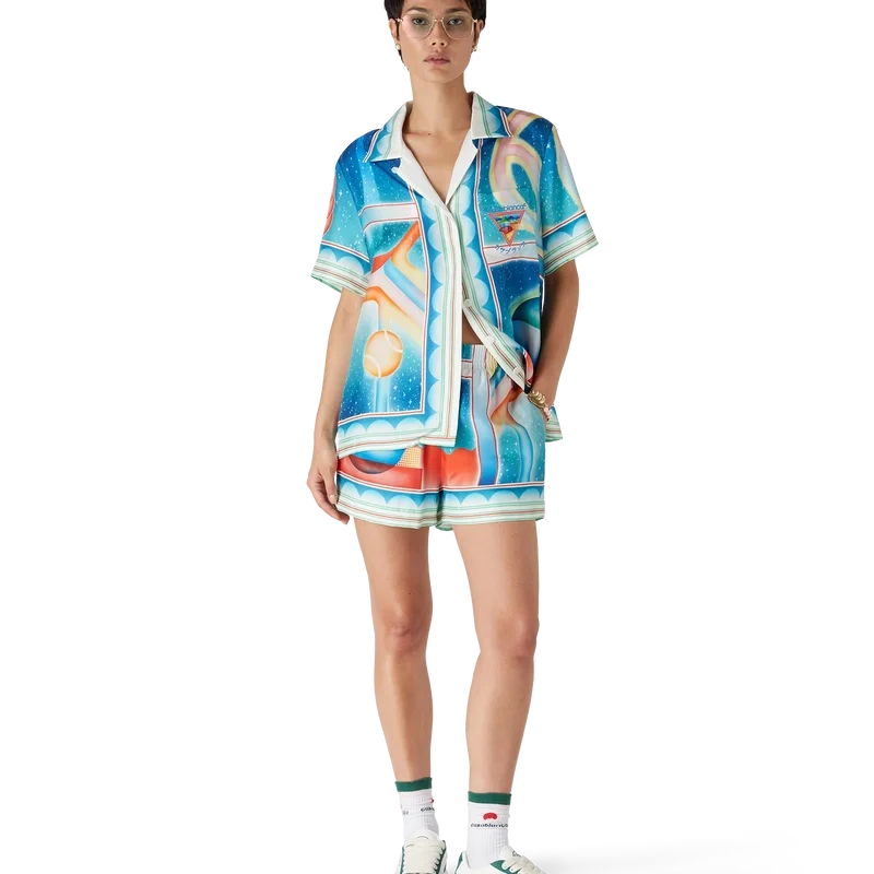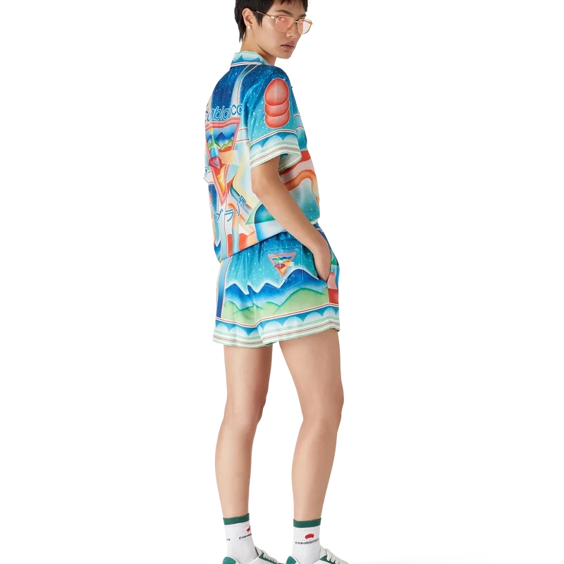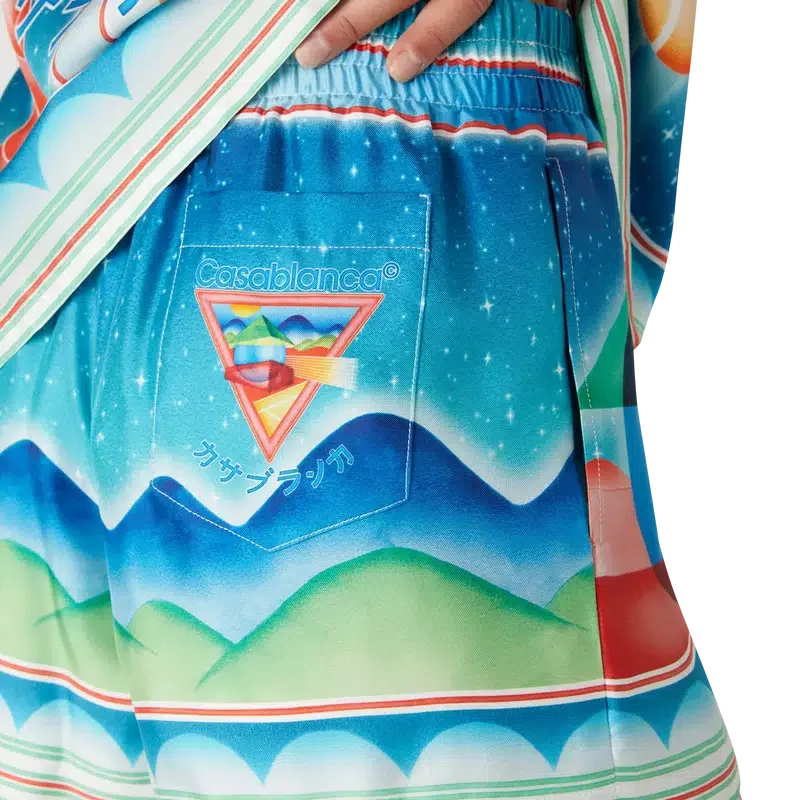 Die Galaxy Court Seidenshorts sind ein durchgehend bedrucktes Design aus Seidentwill. Mit elastischem Bund, Kordelzug, Futter, Seitentaschen in den Beinen und einer Gesäßtasche.