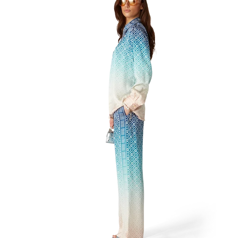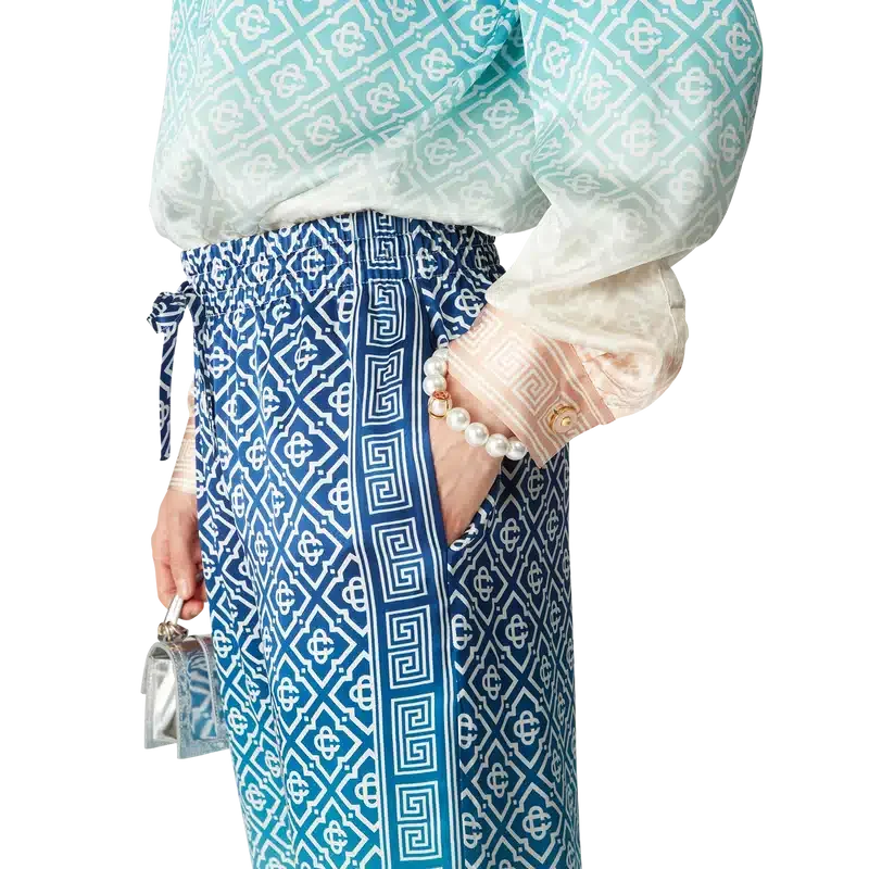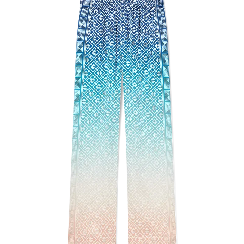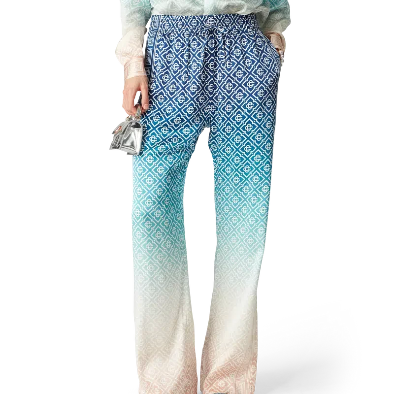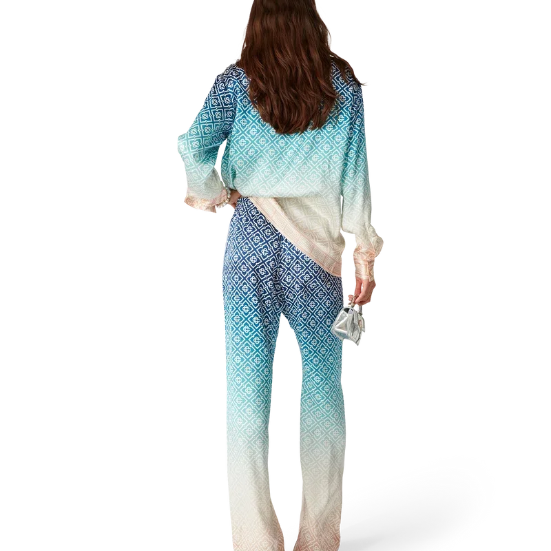 Die Jacquard-Seidenhose mit Farbverlauf ist ein durchgehend bedrucktes Modell mit dem charakteristischen Monogramm des Hauses, gefertigt aus Seidensatin. Mit elastischem Bund, Eingrifftaschen und Futter.