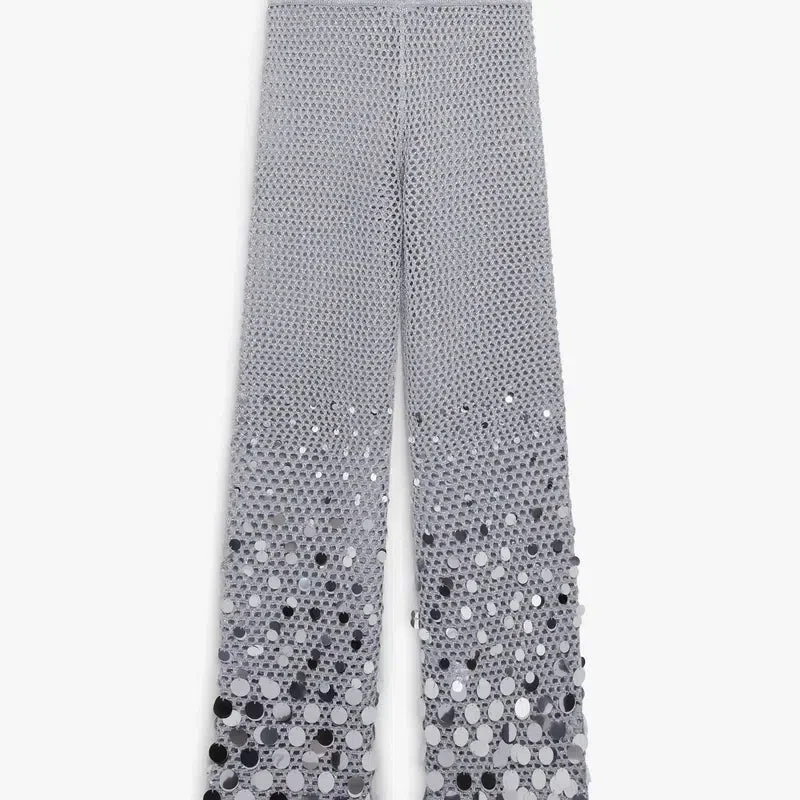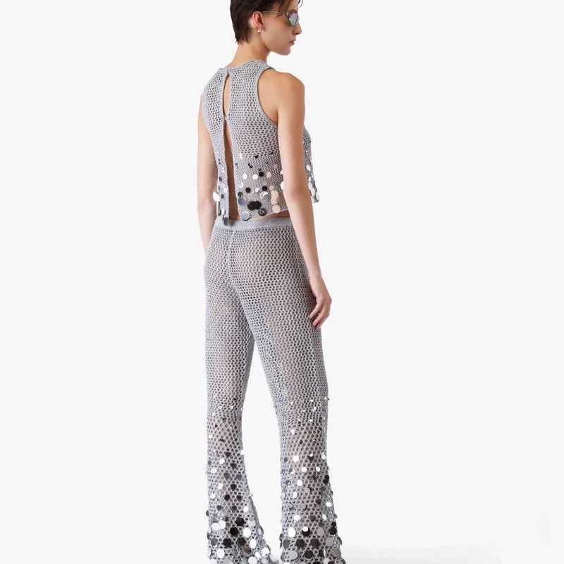 Die silberne Häkelspiegel-Hose ist ein raffiniertes Strickdesign mit einer zarten Häkelspiegel-Konstruktion in Silber. Abgerundet durch einen Bund, einen ausgestellten Saum und eine Fit-and-Flare-Silhouette.
