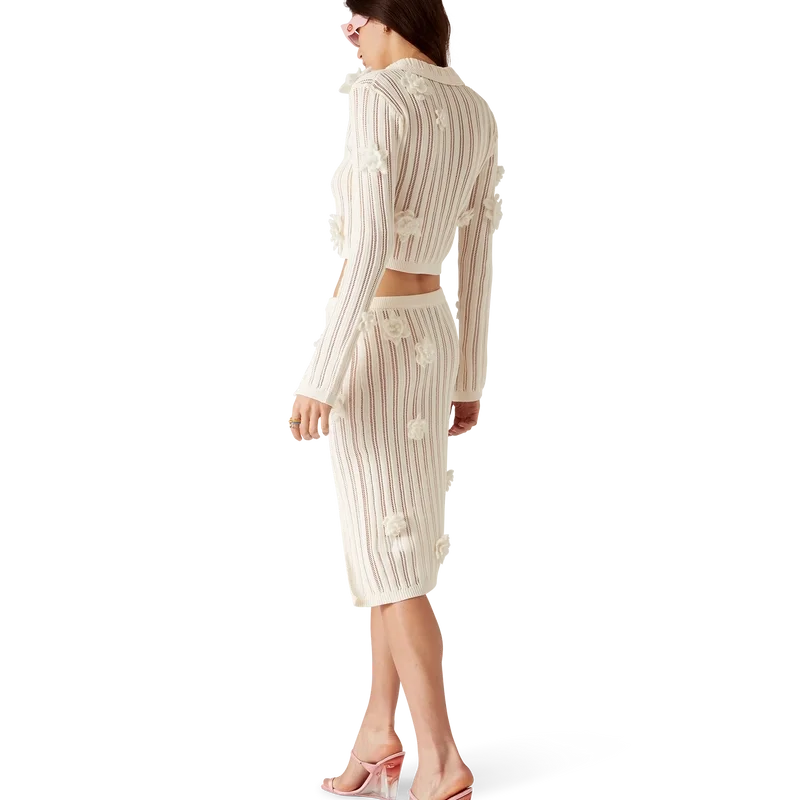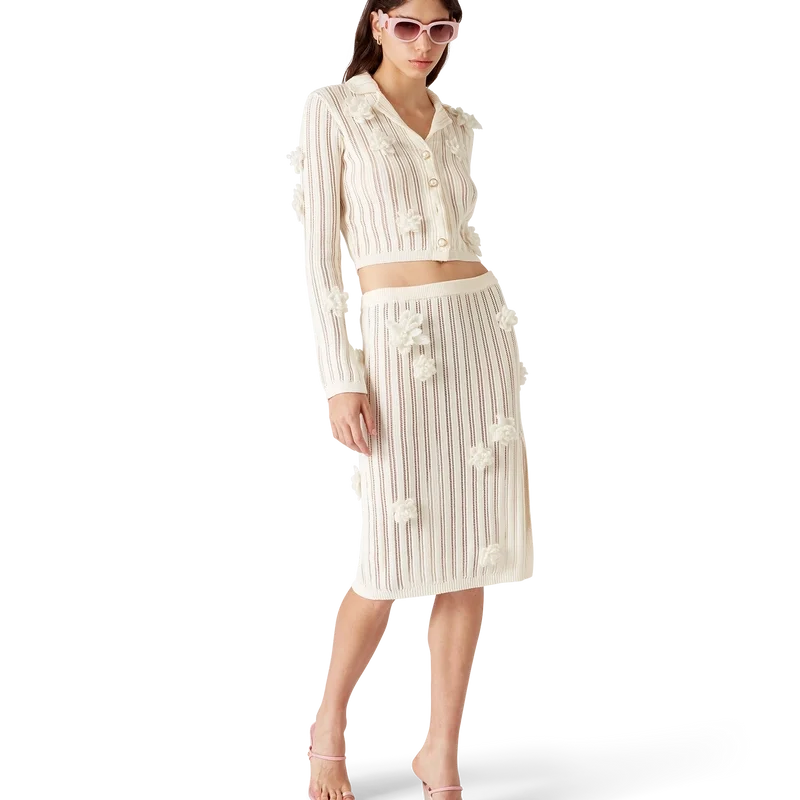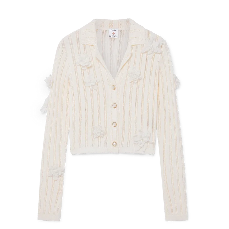 Das Blümchen-Spitzen-Strickhemd ist ein langärmeliges Modell aus Baumwoll-Spitzenstrick. Mit Glockenärmeln mit Schlitzdetail, Kragen, Knopfleiste, charakteristischen goldgerahmten Perlenknöpfen und Applikationen mit Blumenmotiven.