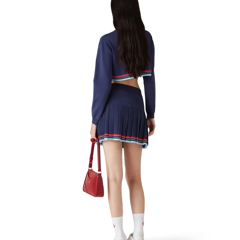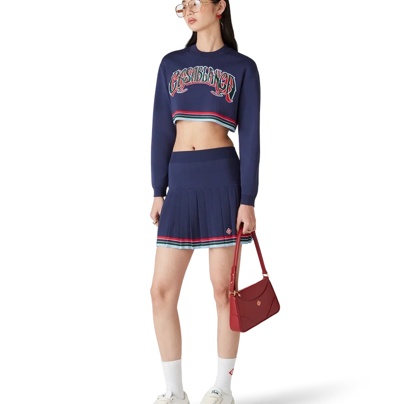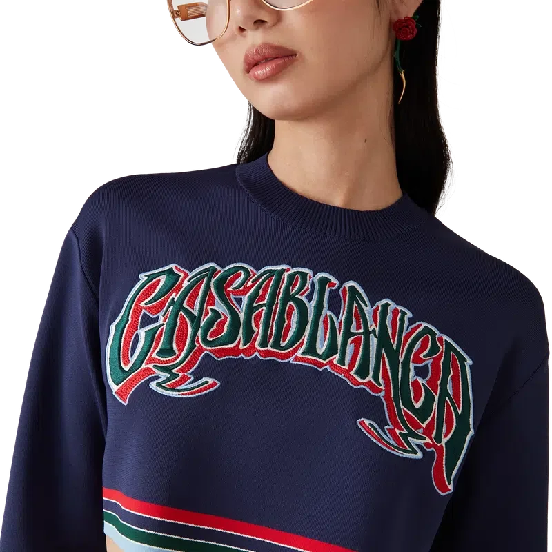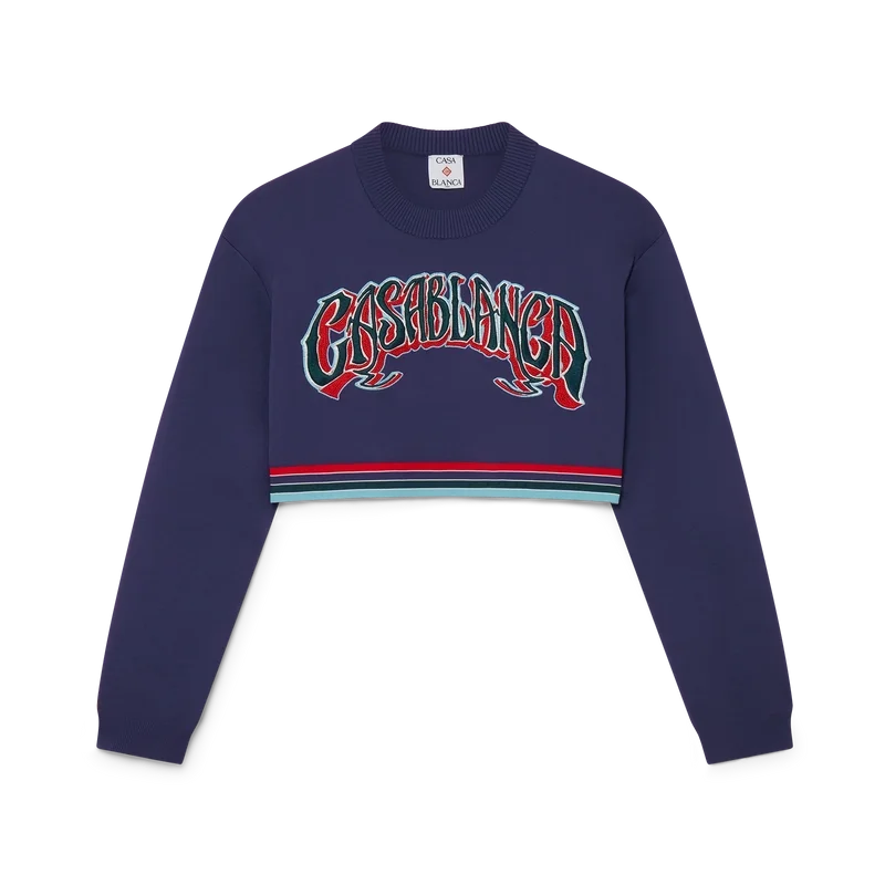 Der kurze Baseball-Pullover ist aus Trikotstoff gefertigt und verfügt über eine gestickte, handgezeichnete Typografie des Casablanca-Logos, inspiriert von der in Tattoos verwendeten gotischen Schriftart. Abgerundet durch einen gerippten Kragen und Ärmelbündchen sowie ein Detail aus roten, weißen, blauen, grünen und marineblauen Querstreifen am Saum.