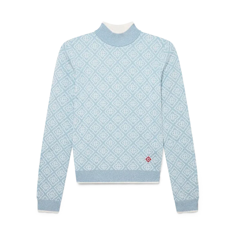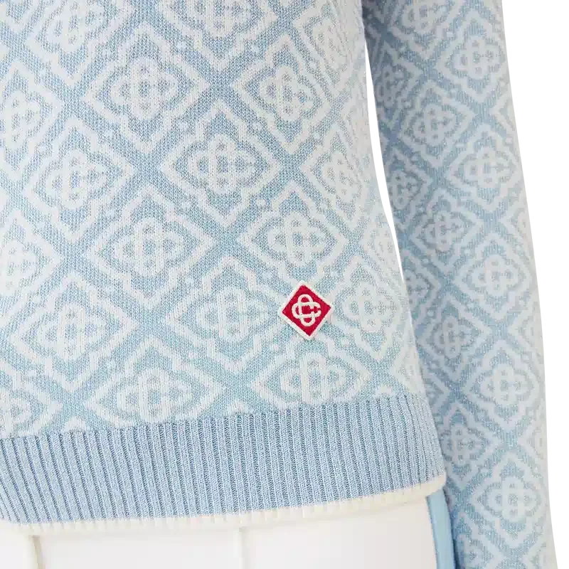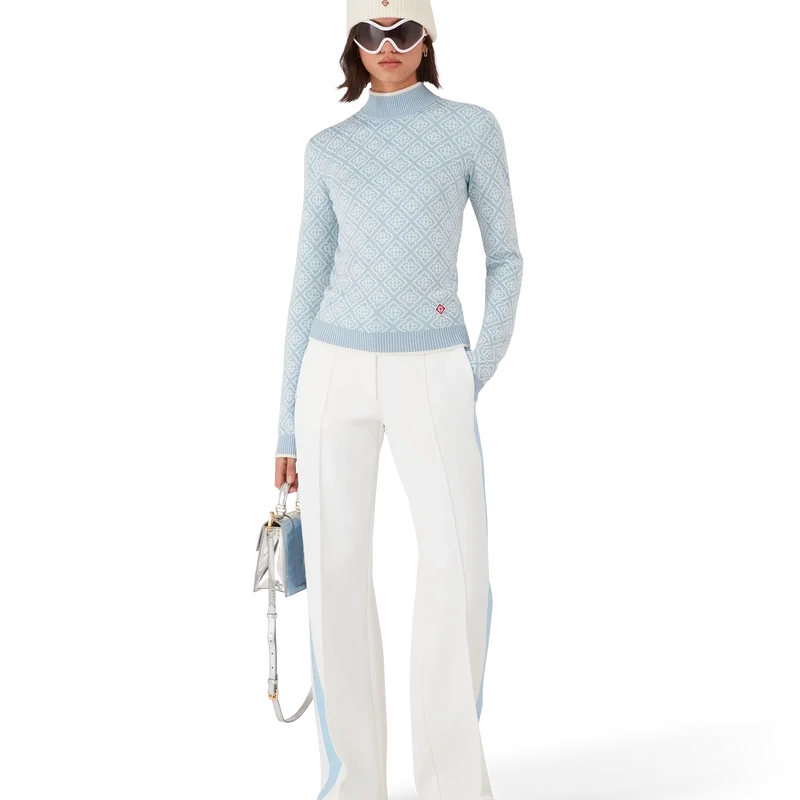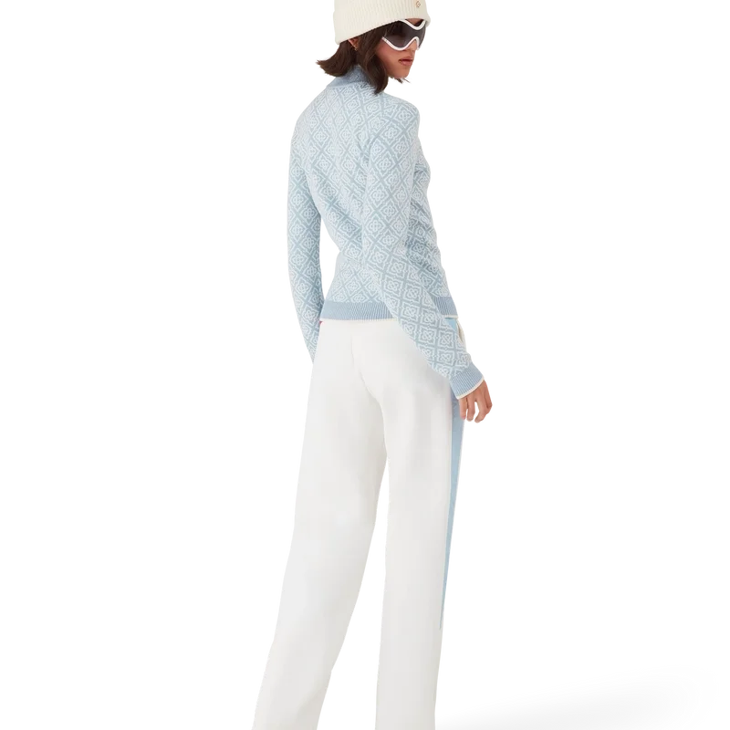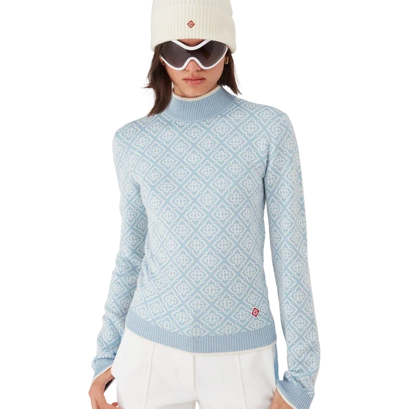 Das Ski Monogram High Neck Top ist ein raffiniertes Apras-Sport-Design aus Merinowolle mit dem charakteristischen blau-weißen Monogramm-Motiv des Hauses, inspiriert von traditionellen japanischen Wintermustern. Es greift die filigrane Schönheit von Eiskristallen an Tempelfenstern und die rhythmische Geometrie schneebedeckter ländlicher Zäune auf.