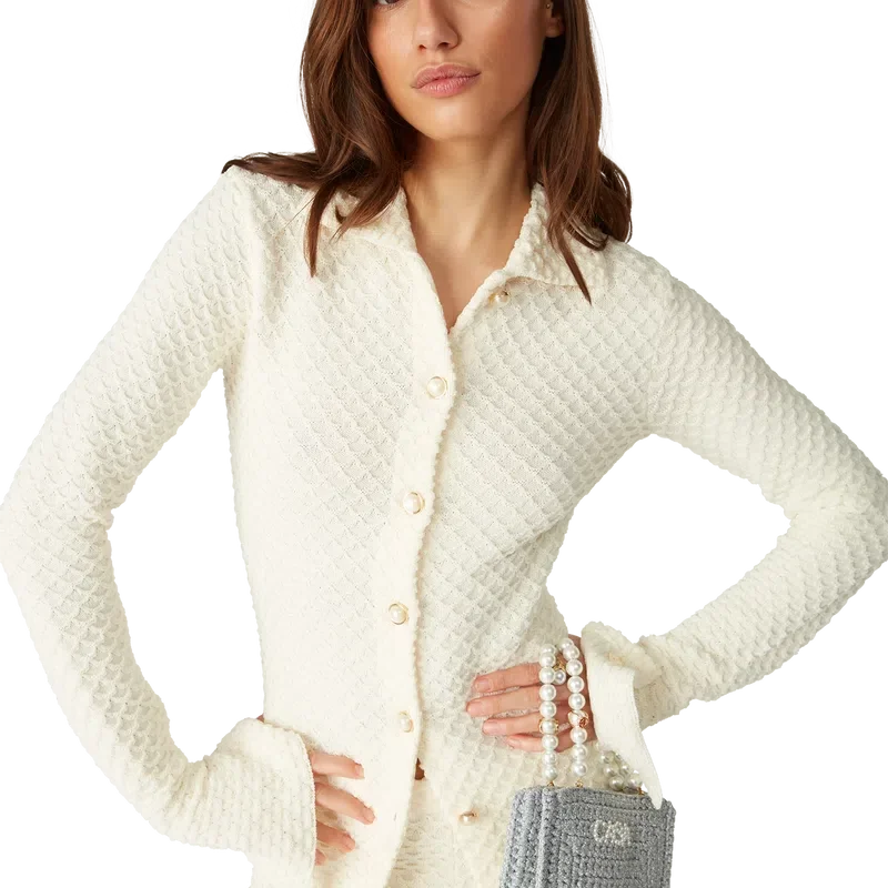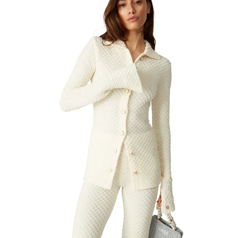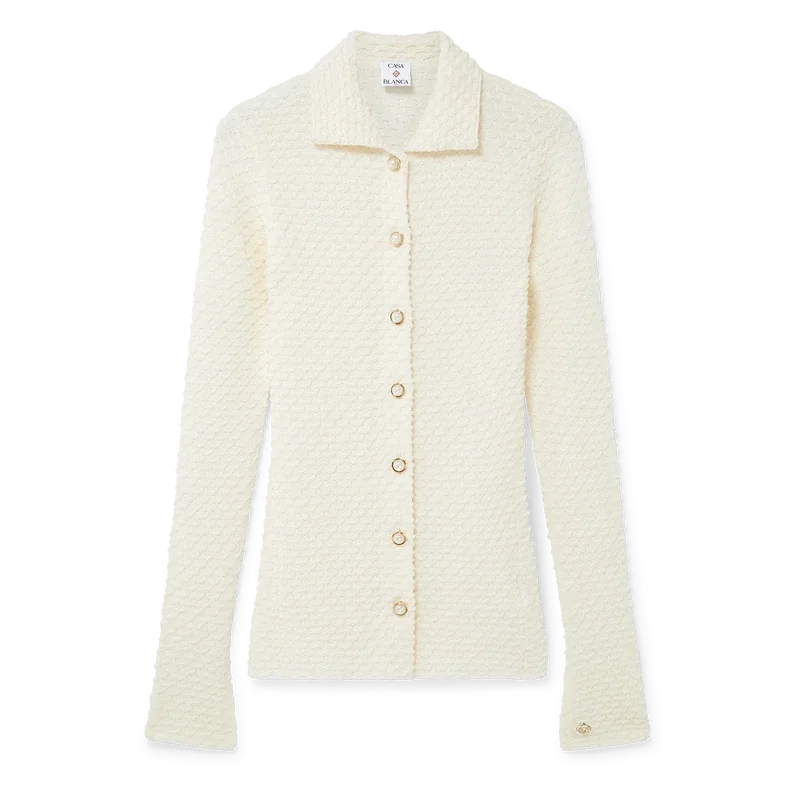 Das strukturierte Strickhemd ist ein langärmeliges Modell aus einem Baumwollmischgewebe. Es verfügt über einen Kragen, ausgestellte Ärmel mit Schlitzen, einen Knopfverschluss vorne, charakteristische goldgeränderte Perlknöpfe und einen vergoldeten, ineinander verschlungenen Cc-Nietenverschluss.