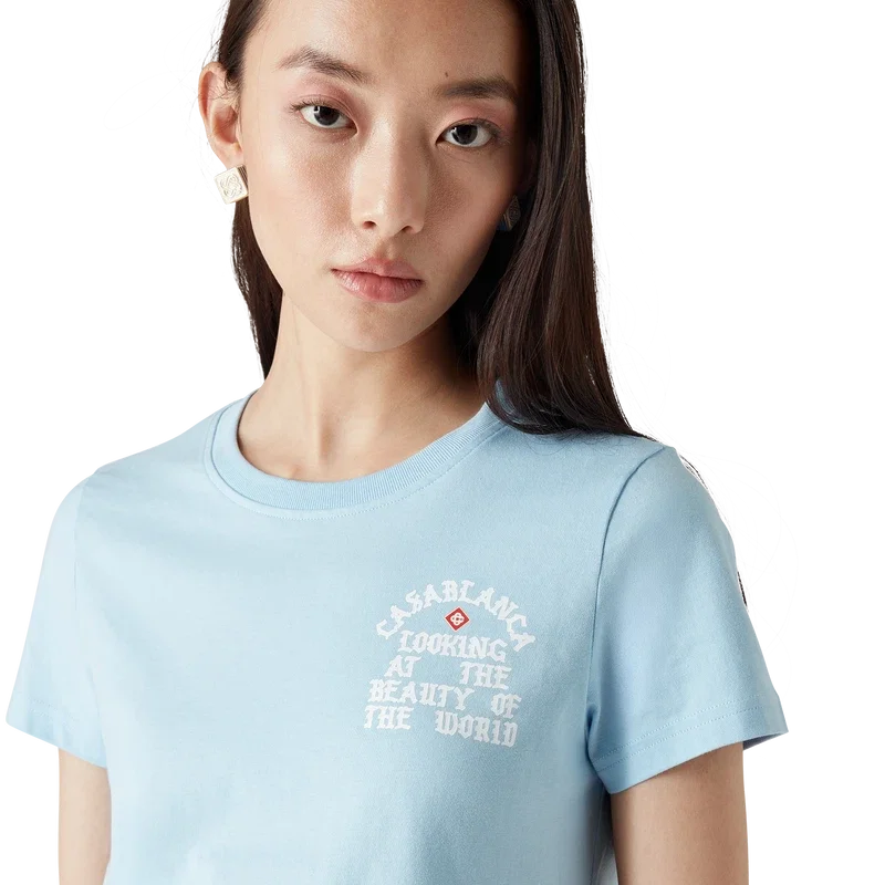 Das „Beauty of the World“-T-Shirt ist ein bedrucktes Kurzarm-Modell aus Bio-Baumwolle, das das Motto der Marke Casablanca in einer von der Street-Culture inspirierten gotischen Schriftart zeigt. Abgerundet wird es durch einen klassischen Rundhalsausschnitt und das charakteristische Diamant-Logo des Hauses.