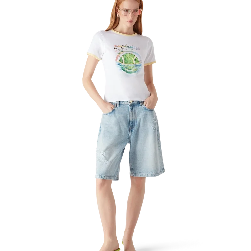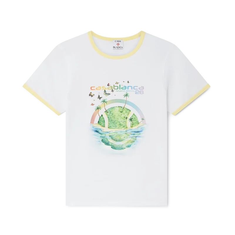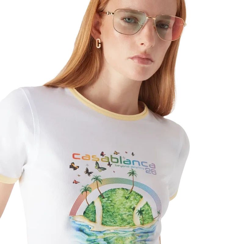 Das Beyond Destiny Longline Ringer T-Shirt hat eine schmale Passform und zeigt das aktuelle Beyond Destiny-Motiv der Saison. Durch Halbton-Verläufe entsteht Tiefe, und das von Videospielen inspirierte Branding sorgt für einen verspielten, futuristischen Look. Abgerundet wird das Design durch kontrastierende Rippbündchen am Rundhalsausschnitt und an den Ärmelbündchen, einen verlängerten Saum sowie das Casablanca-Logo als Farbverlaufstext auf der Brust.