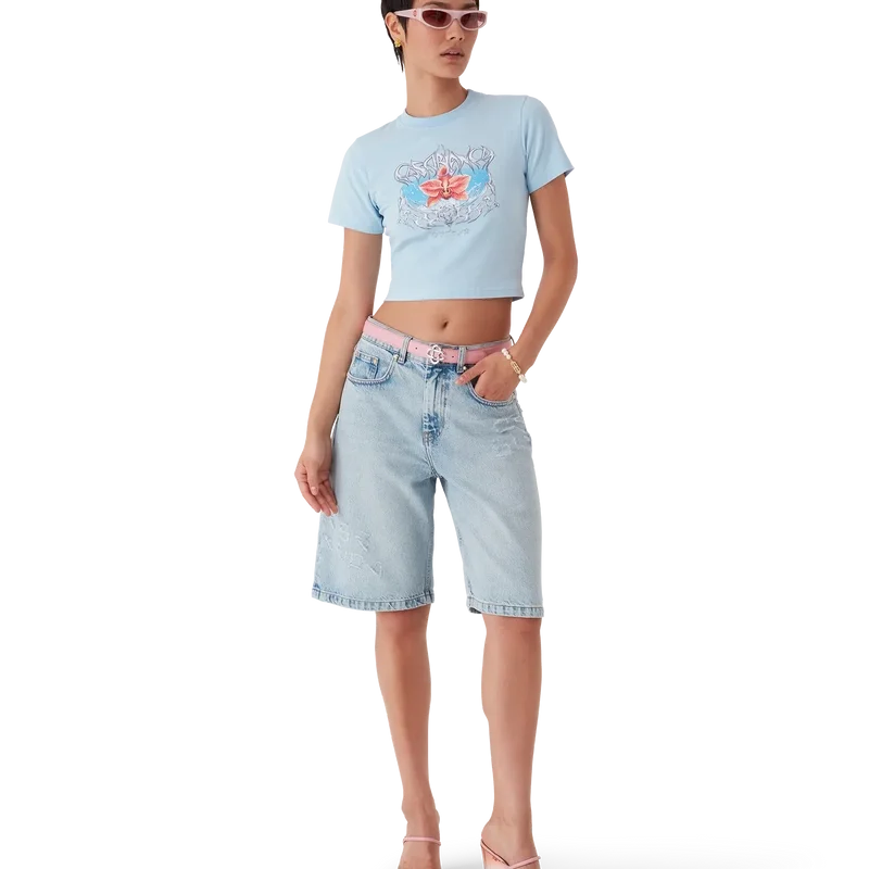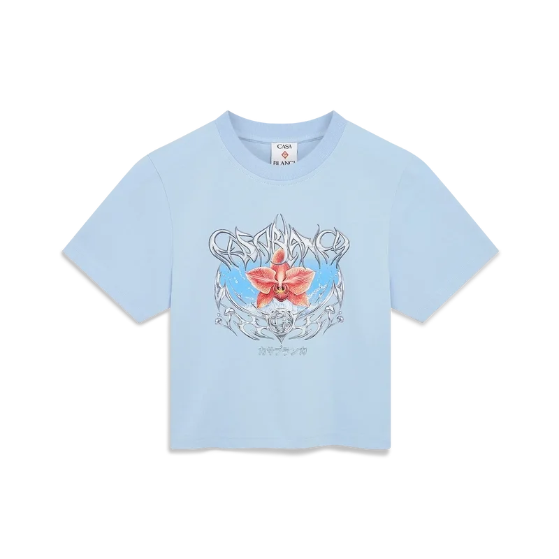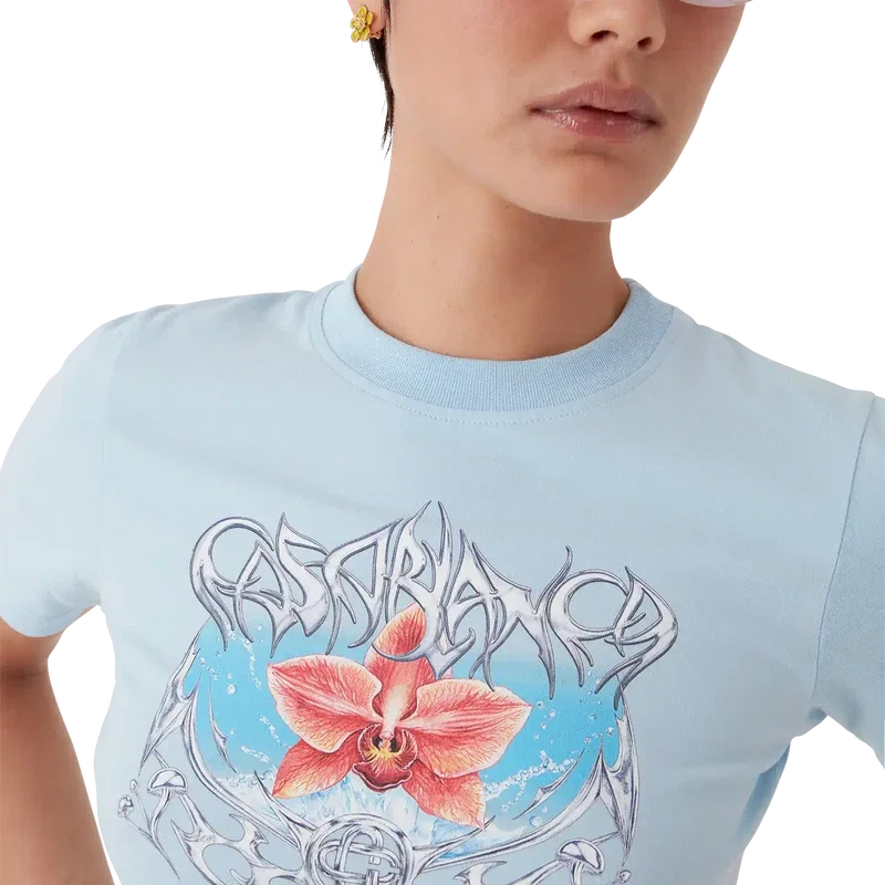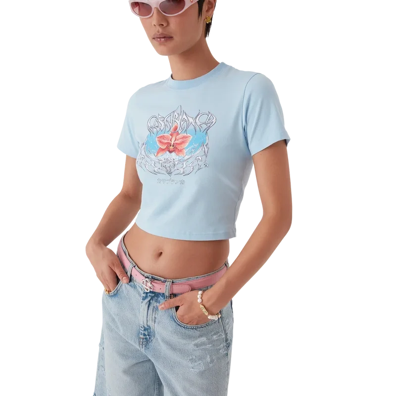Das Blades Cropped T-Shirt ist ein figurbetontes, bedrucktes Design mit einem Motiv, das mit dem Kontrast zwischen zwei gegensätzlichen Empfindungen spielt – der Schärfe der Klinge und dem kalten, silbernen Chrom, kontrastiert mit der Wärme der Natur, wie den kräftigen Rosa- und Rottönen einer Orchideenblüte. Das Hinzufügen von Wasser verleiht dem Design ein frisches, klares Element. Abgerundet durch einen klassischen Rundhalsausschnitt.