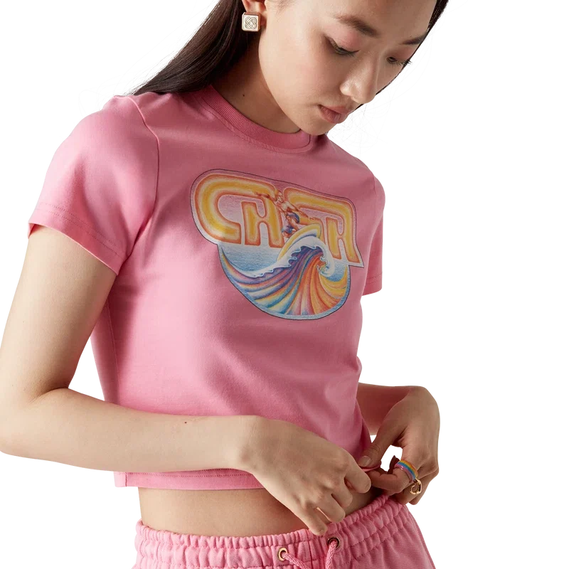 Das Casa Surf Cropped T-Shirt ist ein bedrucktes Kurzarm-Modell aus Pima-Baumwolle mit einem charakteristischen Design, das von sonnengebleichten Vintage-Surfboards aus den 70er Jahren inspiriert ist. Abgerundet durch einen klassischen Rundhalsausschnitt. Entworfen, um oberhalb des Bauchnabels zu enden.
