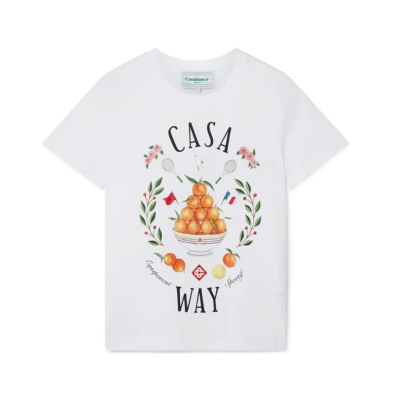 Das Casa Way T-Shirt zeigt einen Aufdruck des charakteristischen Kunstwerks des Hauses, das für diese Saison neu interpretiert wurde und Elemente des Tennissports enthält. Es besteht aus 100 % Bio-Baumwolle und verfügt über einen klassischen Rundhalsausschnitt sowie ein Casablanca-Markenlabel.