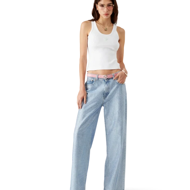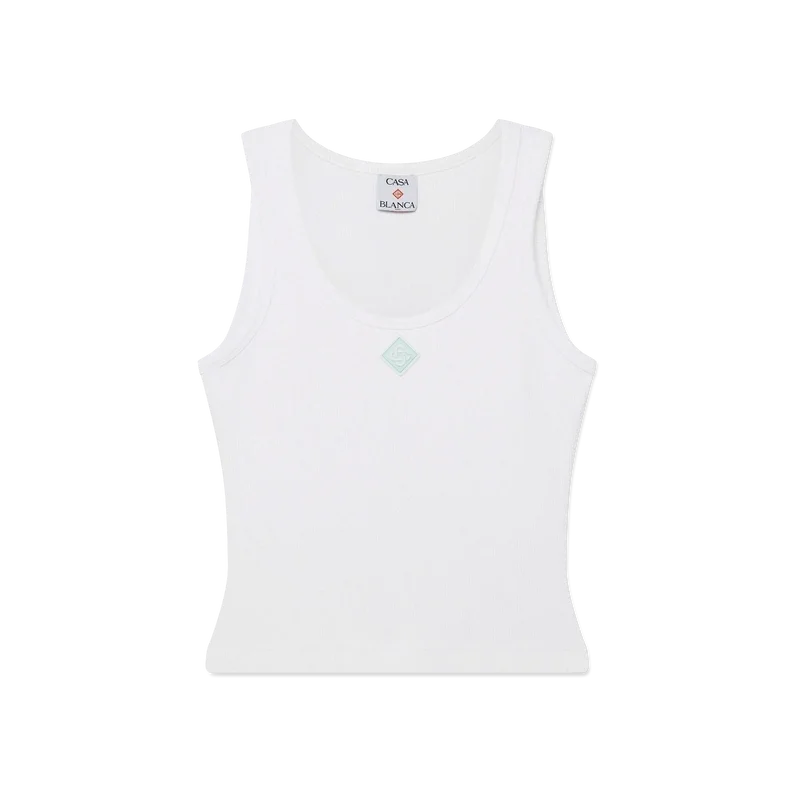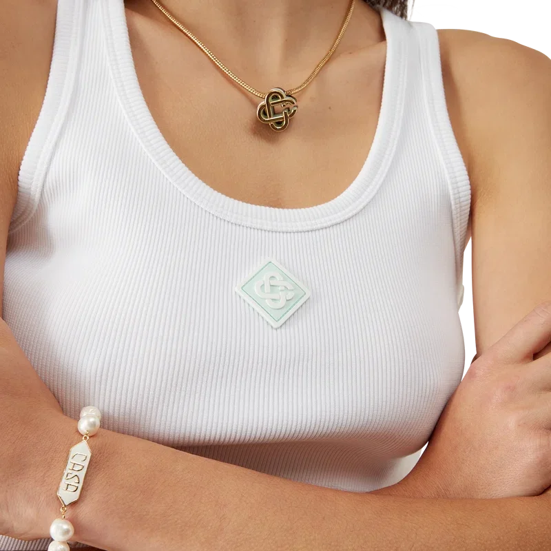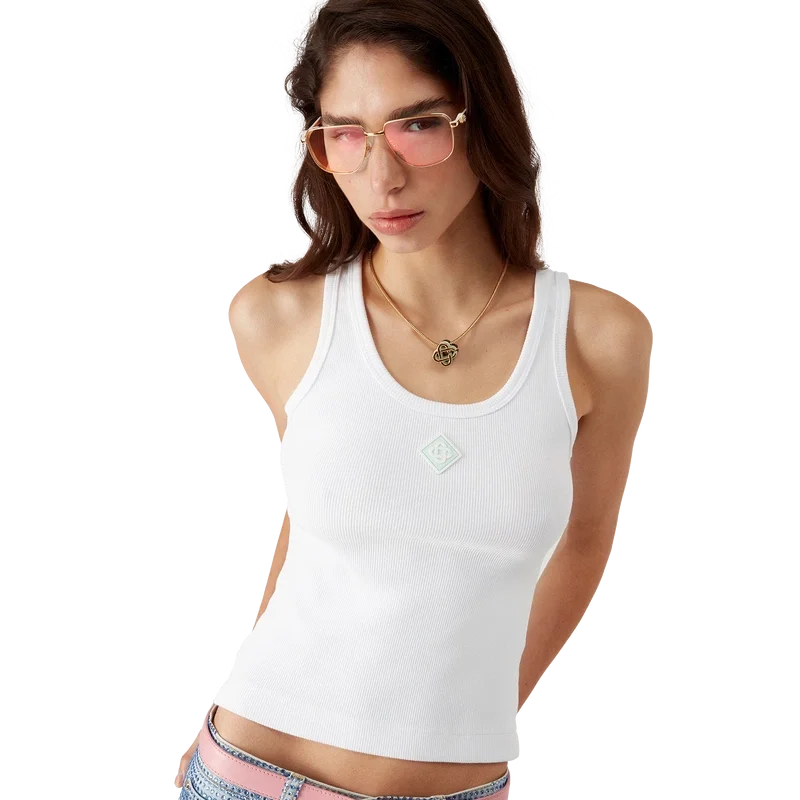 Das gerippte Jersey-Tanktop ist ein ärmelloses, figurbetontes Modell in kurzer Passform, gefertigt aus geripptem Jersey-Stoff. Es ist mit einem silikonierten, ineinander verschlungenen CC-Logo-Aufnäher, einem U-Ausschnitt und weißen Wellenmuster-Details an den Kanten um den Halsausschnitt und die Armausschnitte versehen.