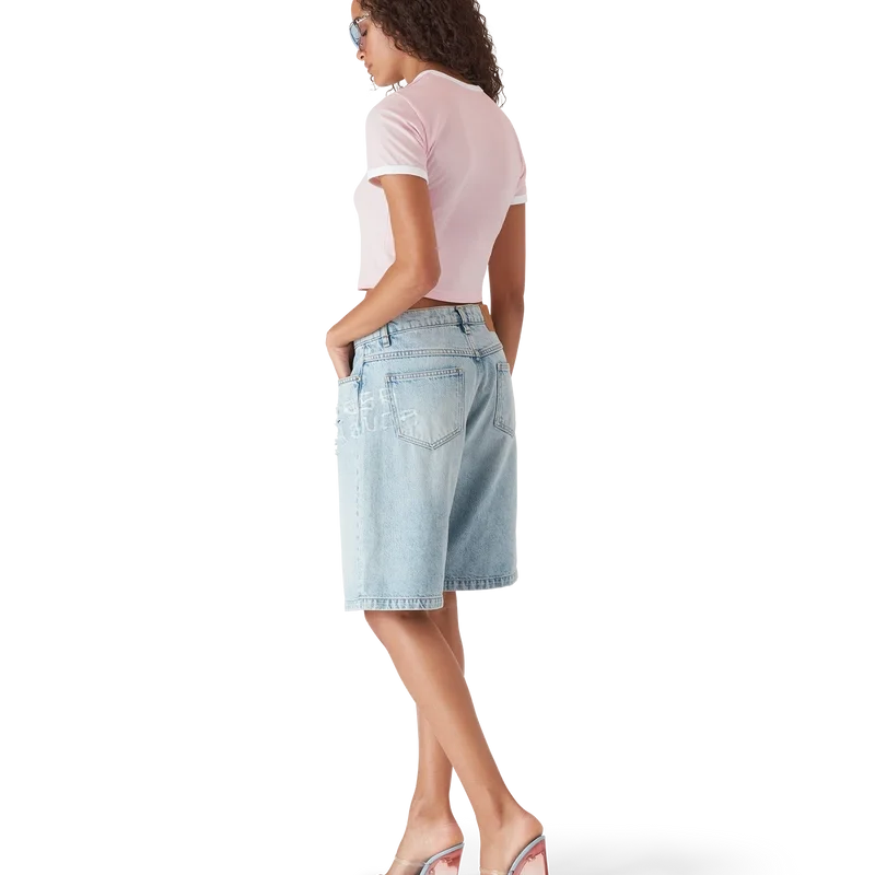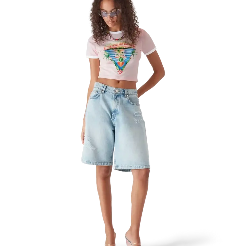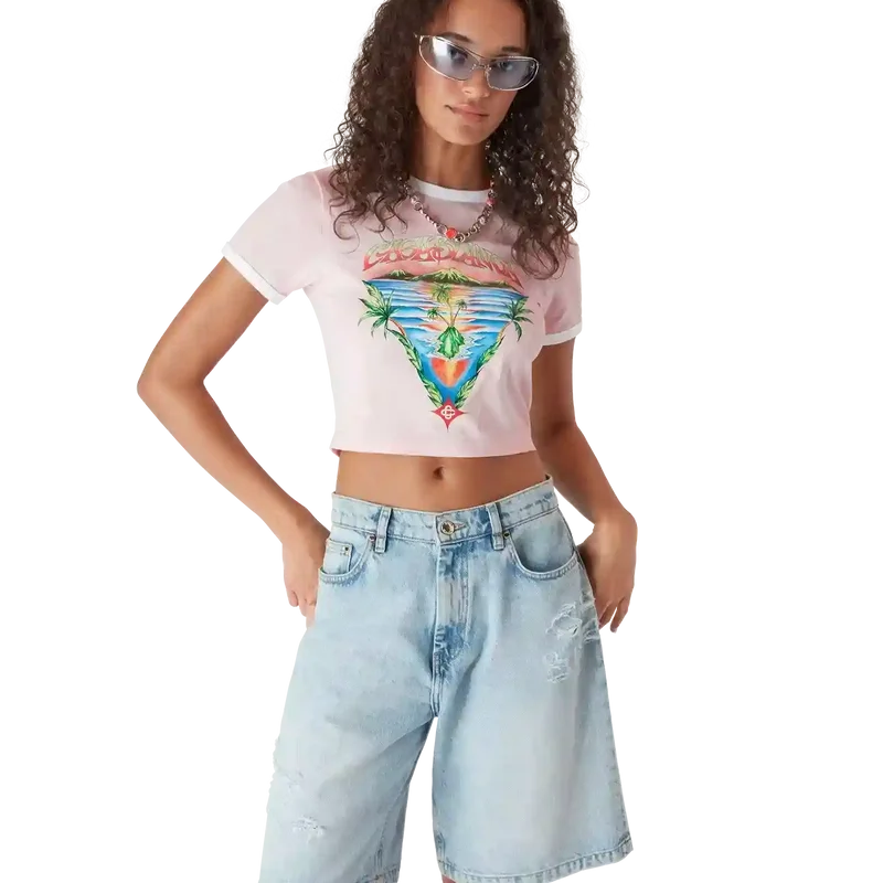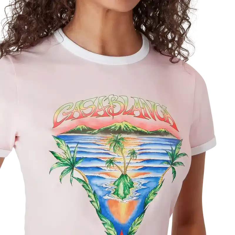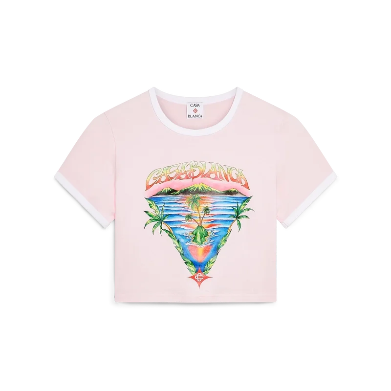Das Innocence Triangle Baby-T-Shirt zeigt eine Meereslandschaft bei Sonnenuntergang mit einer Insel im Zentrum, dargestellt in einem Stil, der von klassischer Surf-T-Shirt-Kunst beeinflusst ist. Das Motiv fängt die ätherische Schönheit der goldenen Stunde über tropischen Gewässern ein und präsentiert eine idealisierte Vision eines Strandparadieses durch die raffinierte Sport- und Freizeit-Perspektive des Hauses. Abgerundet durch einen klassischen Rundhalsausschnitt, kurze Ärmel und eine Slim-Fit-Passform, die den raffinierten Ansatz des Hauses in Sachen Freizeitmode verkörpert.