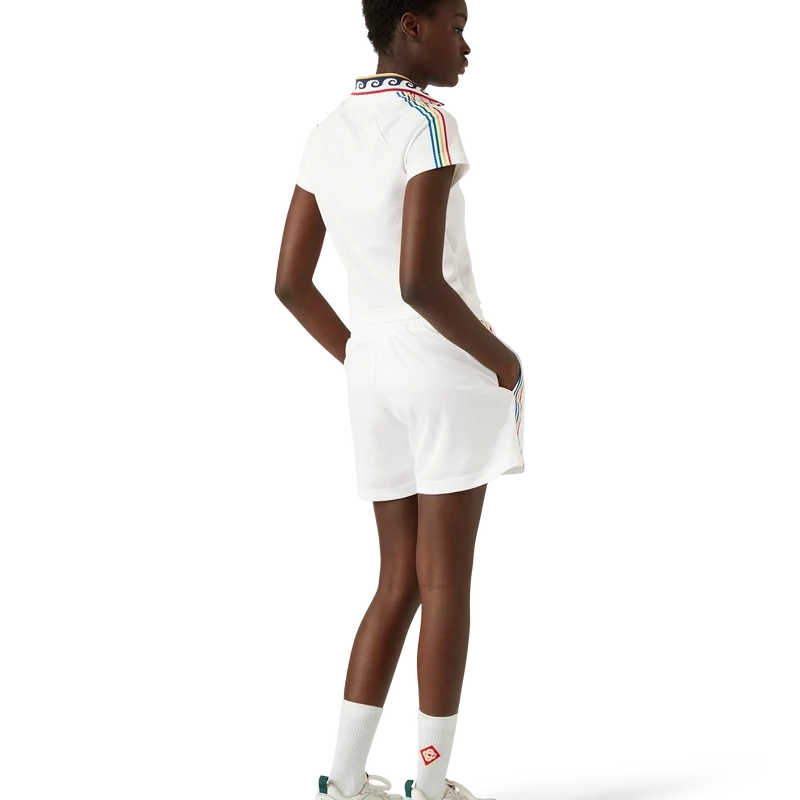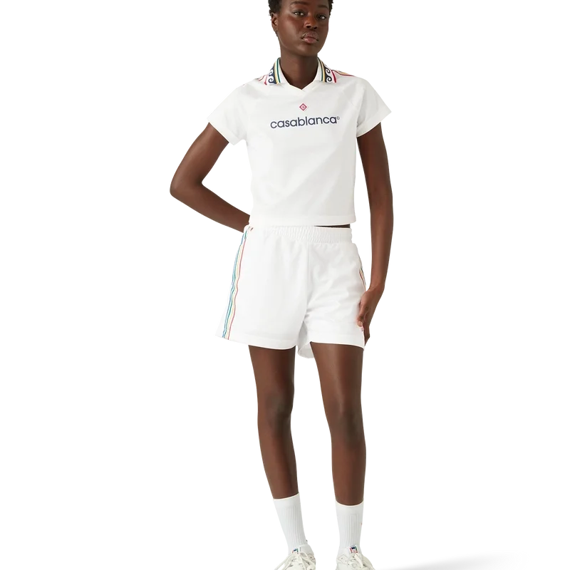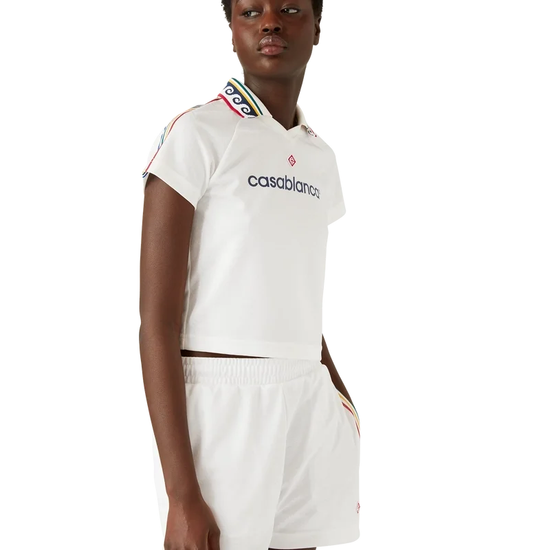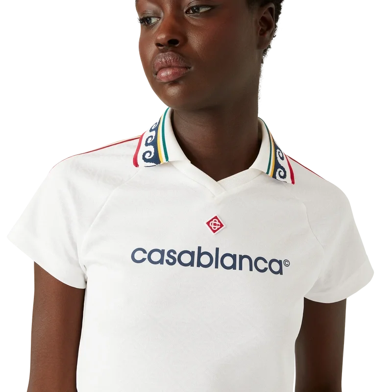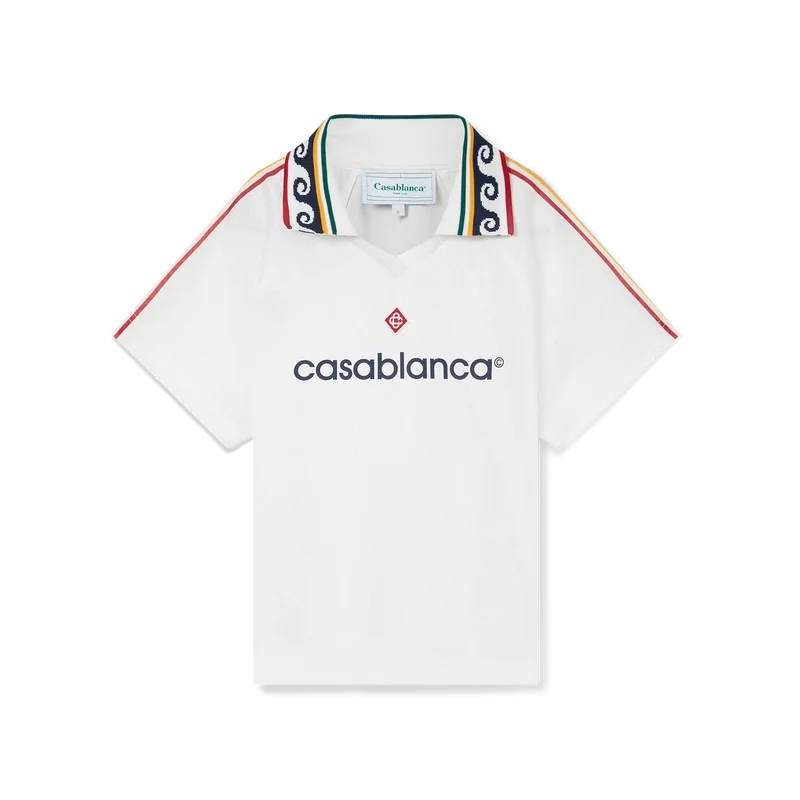 Das Jacquard-Monogramm-Fußballhemd ist ein tailliertes, kurzes Sporthemd mit kurzen Ärmeln, das mit dem charakteristischen Diamond Monogram des Hauses verziert ist. Es ist aus einem Jacquard-Monogramm-Stoff gefertigt und mit der charakteristischen Diamond Monogram-Logo-Applikation des Hauses, einem gerippten Kragen, gestreiften Schulterdetails und einem Casablanca-Logo auf der Brust versehen.