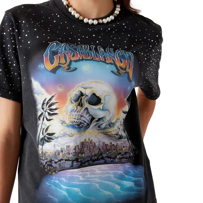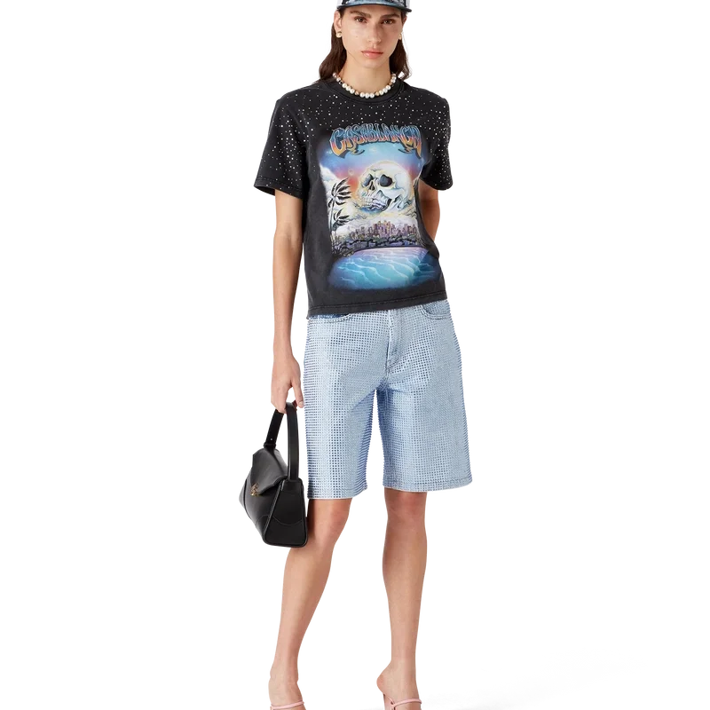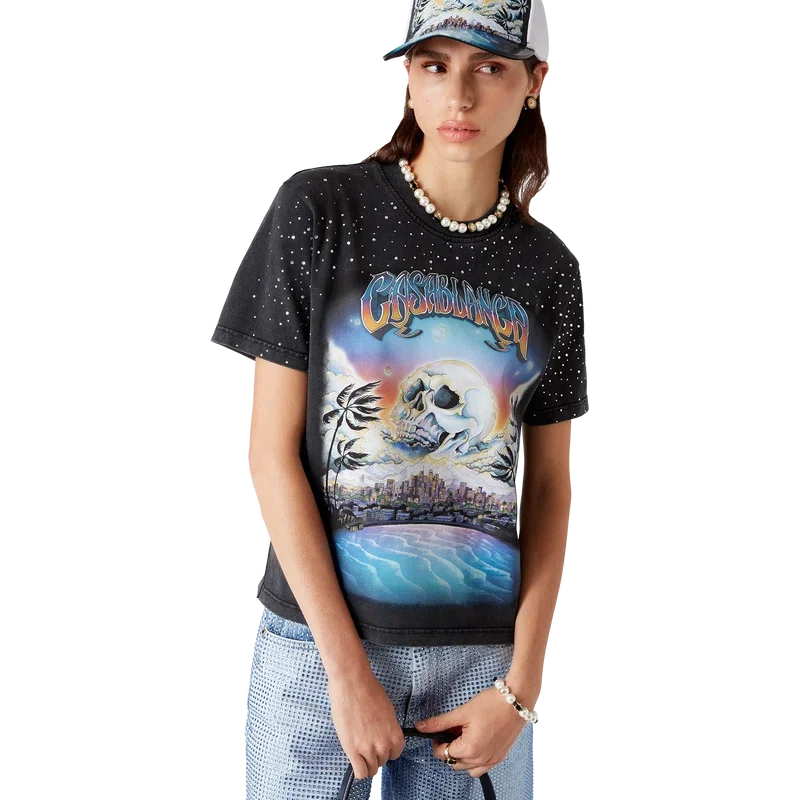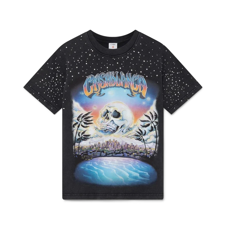 Das La Pramonition T-Shirt mit Kristallverzierung ist ein kurzärmeliges Modell aus bedrucktem Bio-Baumwollstoff mit dem Artwork der Saison, inspiriert von einer unheimlichen Vision der Skyline von La bei Nacht, mit UFO-Elementen, die an Vintage-Sci-Fi-Inspirationen anknüpfen. Abgerundet durch einen klassischen Rundhalsausschnitt.