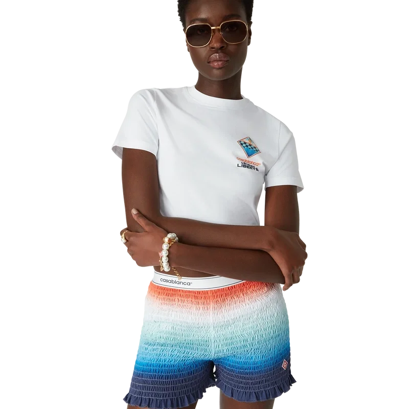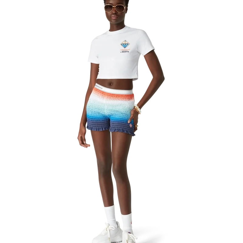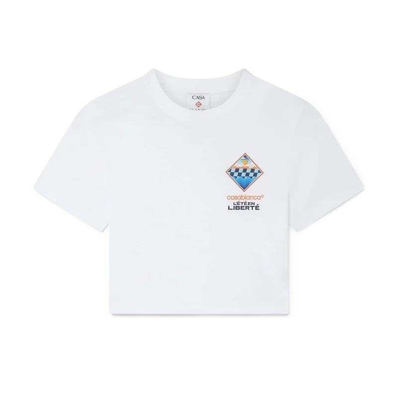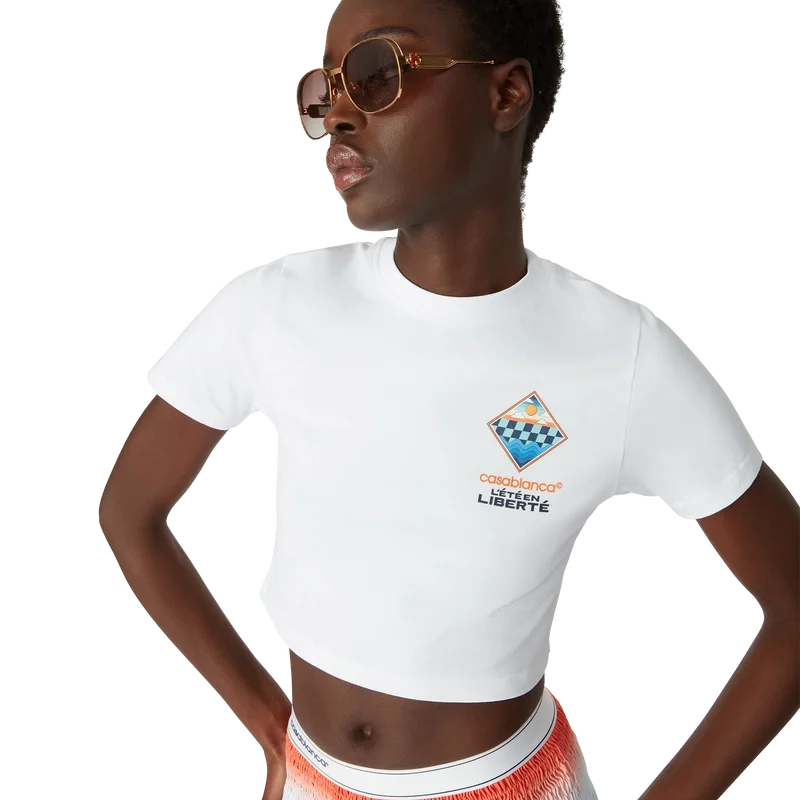 Das L’ÉTa En Liberta Cropped T-Shirt ist ein bedrucktes Kurzarm-Modell aus Bio-Baumwolle, das mit dem saisonalen Design des Hauses verziert ist, das Elemente aus Natur, Architektur und Tennis aufgreift. Abgerundet wird es durch einen klassischen Rundhalsausschnitt. Das T-Shirt ist so geschnitten, dass es oberhalb des Bauchnabels endet.