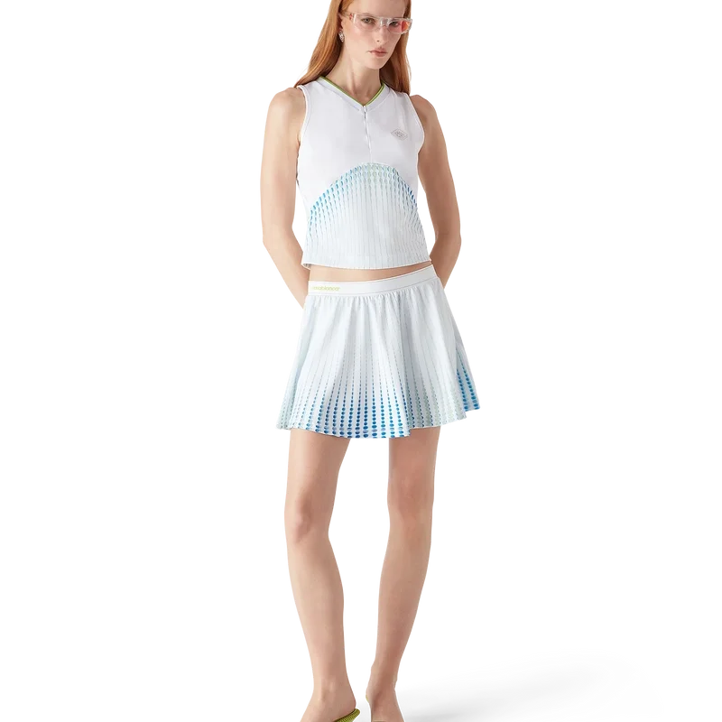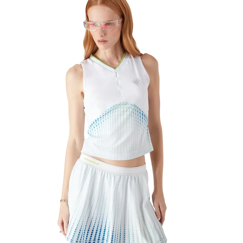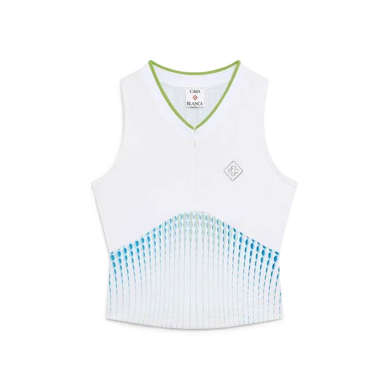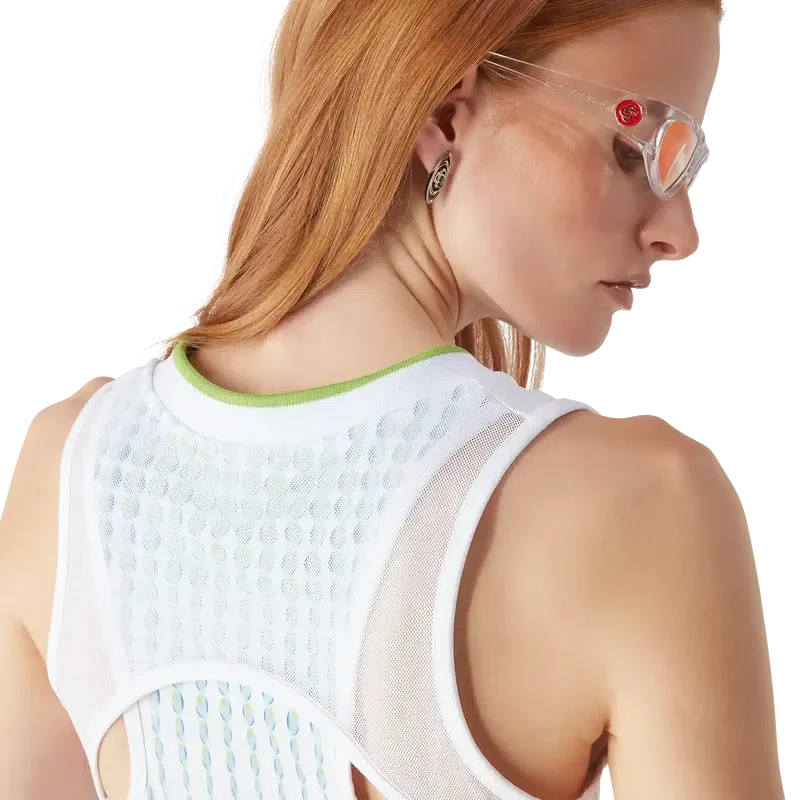 Das Tennis-Jacquard-Top ist ein ärmelloses Design mit dem silbernen Diamant-Logo des Hauses. Abgerundet durch einen flachen V-Ausschnitt in Kontrastfarbe, einen Reißverschluss, ein bedrucktes Oberteil und eine schmale Silhouette.