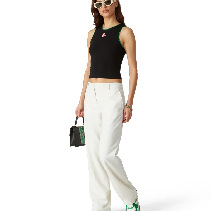 Das Tanktop mit Diamant-Logo ist ein kurz geschnittenes, ärmelloses Modell aus Baumwollstoff. Es ist mit dem charakteristischen Diamant-Logo des Hauses, grünen Kanten und einem klassischen Rundhalsausschnitt versehen. Es ist so geschnitten, dass es über dem Bauchnabel sitzt.
