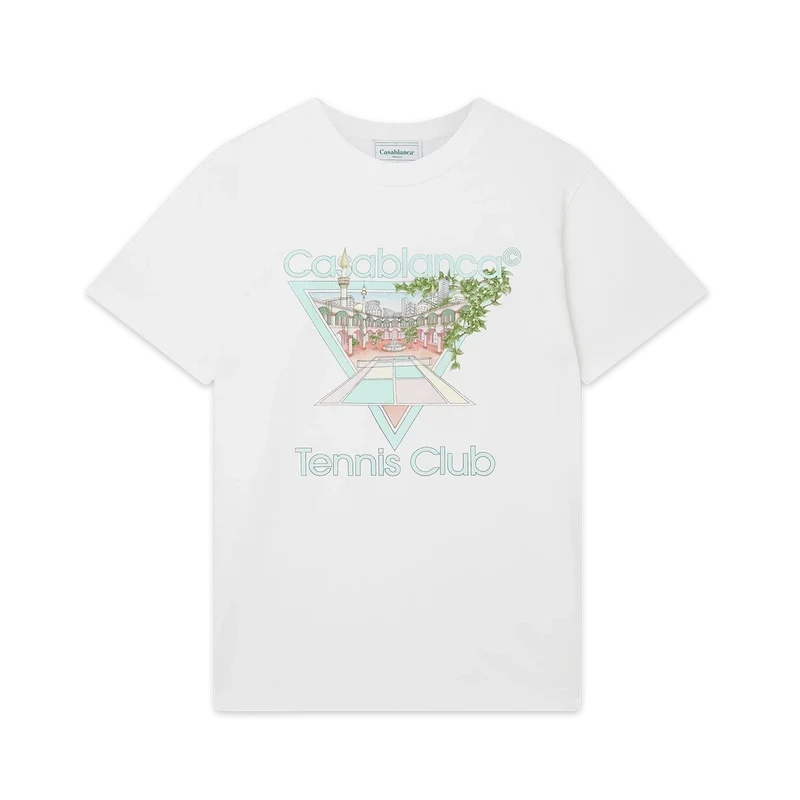 Das Tennis Club Icon Damen-T-Shirt aus Bio-Baumwolle mit Siebdruck zeigt eine saisonale Interpretation unseres charakteristischen Tennis Club Icon-Motivs. Mit klassischem Rundhalsausschnitt, kurzen Ärmeln und einem Casablanca Paris-Markenlabel, entworfen für eine lockere Passform.