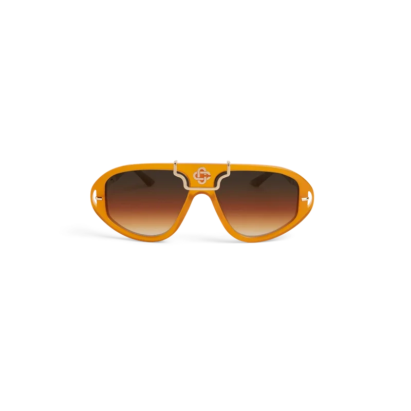 Die markante orange-goldene Acetat-Struktur der Hacienda-Sonnenbrille prägt diese rechteckige Sonnenbrille. Hier befindet sich das charakteristische Casablanca-Diamond Monogram-Logo auf dem Nasensteg. Die Sunset-Verlaufsgläser bieten 100 % UV-Schutz und das Modell wird komplett mit einer Casablanca-Box, einem Reinigungstuch und einem Garantieschein geliefert.