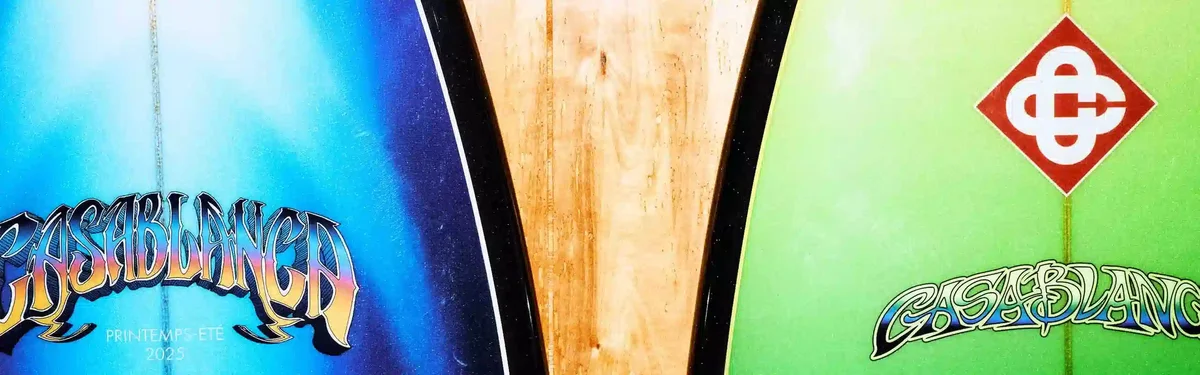 Das handgefertigte Casablanca Retro-Surfboard besticht durch ein raffiniertes Design mit dem Farbverlauf der Saison. Es besteht aus Polyurethanschaum mit einer Konstruktion aus Polyesterharz und Glasfaser. Abgerundet wird es durch mehrfarbige Farbverlaufsdetails und das Branding, das den gehobenen Ansatz des Hauses in Bezug auf Sport- und Freizeitcodes widerspiegelt. Das Casablanca-Surfboard misst 178,2 cm (von der Nase bis zum Heck) x 53 cm (von Rail zu Rail an der breitesten Stelle). Dieser Artikel wird ohne Finnen und Leash geliefert.