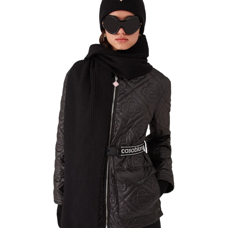 Der Ski-Schal ist ein raffiniertes Design aus weißem Rippstrick aus Wolle, inspiriert vom unberührten Pulverschnee, der die ländlichen Dörfer Hokkaidos in Japan bedeckt. Das Design erinnert an frostbedeckte Bambushaine und Bauernhäuser, die in alpinen Tälern eingebettet sind, und verkörpert mit seiner präzisen Verarbeitung die Apras-Sport-Kodizes des Hauses.