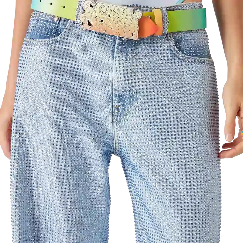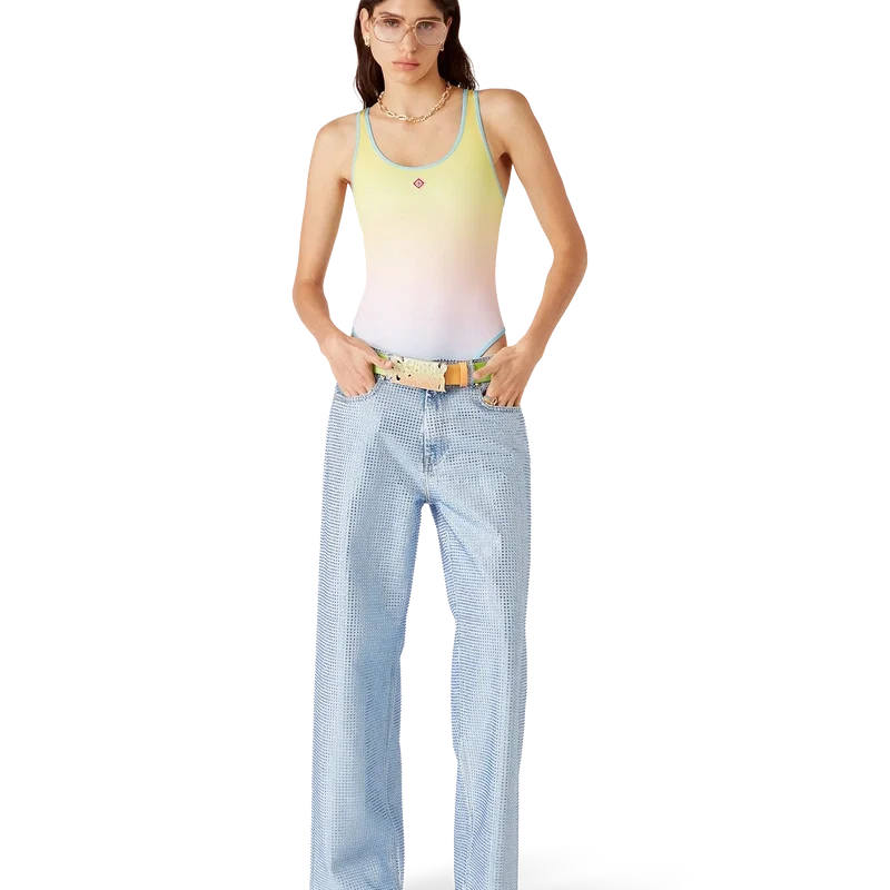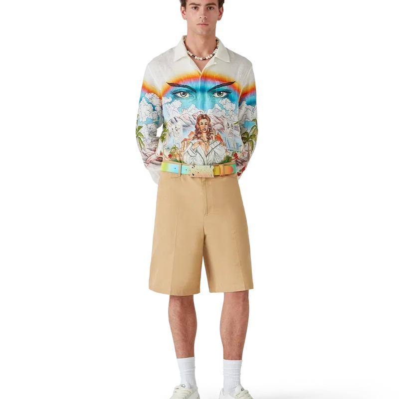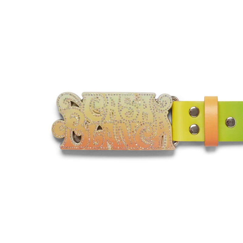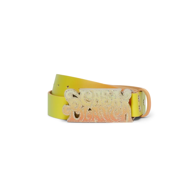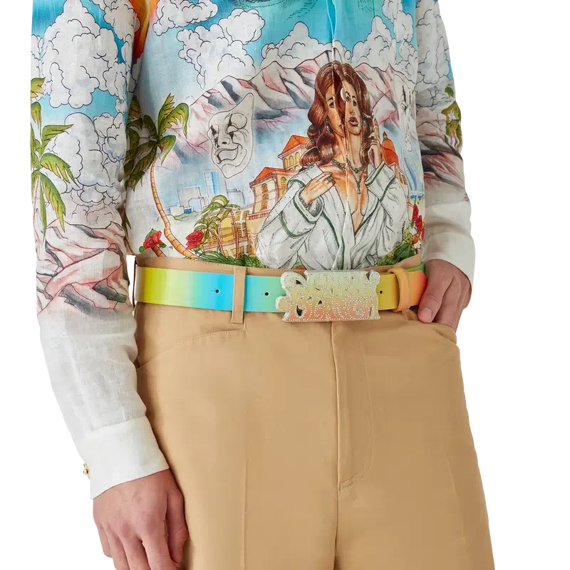 Der La Musique Gürtel ist ein mehrfarbiges Design mit Farbverlauf, das sich durch einen von den 70er Jahren inspirierten psychedelischen Druck und leuchtende Farben auszeichnet, die eine Hommage an Bootsy Collins’ legendären Beitrag zur Funk-Musikszene darstellen. Er ist aus Kalbsleder gefertigt und mit einer lackierten Messingschnalle versehen, die das Casablanca-Logo in einer von den 70er Jahren inspirierten Schriftart zeigt.