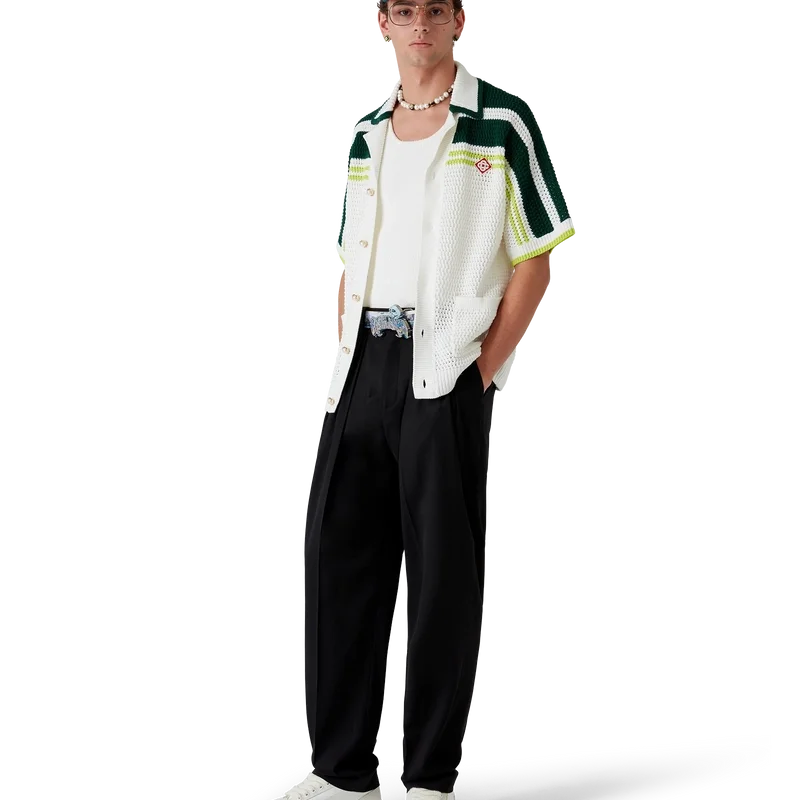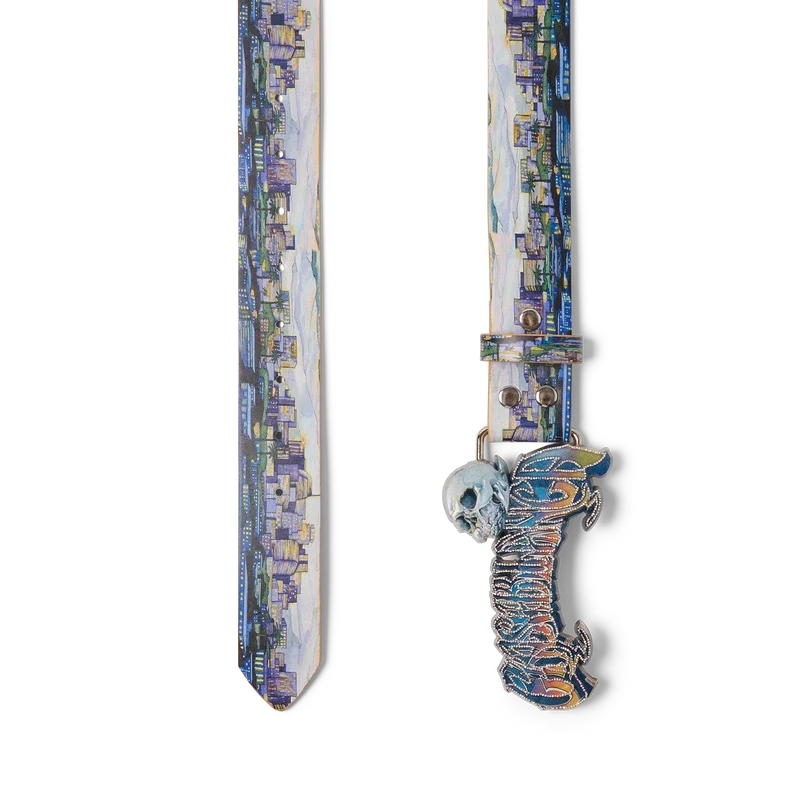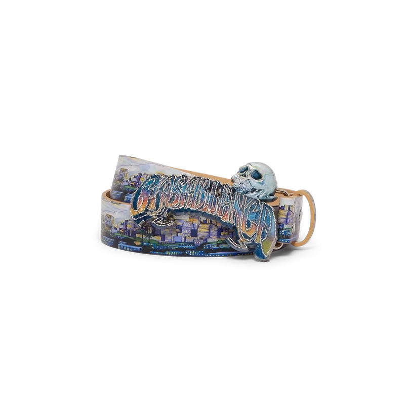 Der La Premonition Gürtel ist ein Design mit dem saisonalen Kunstwerk des Hauses, inspiriert von einer unheimlichen Vision der Skyline von La bei Nacht, mit UFO-Elementen, die an Vintage-Sci-Fi-Inspirationen anknüpfen, gefertigt aus Kalbsleder. Abgerundet wird er durch eine lackierte Messingschnalle mit handgezeichneter Typografie des Casablanca-Logos, inspiriert von der in Tattoos verwendeten gotischen Schriftart, im Farbverlauf der Saison und einem Totenkopf.