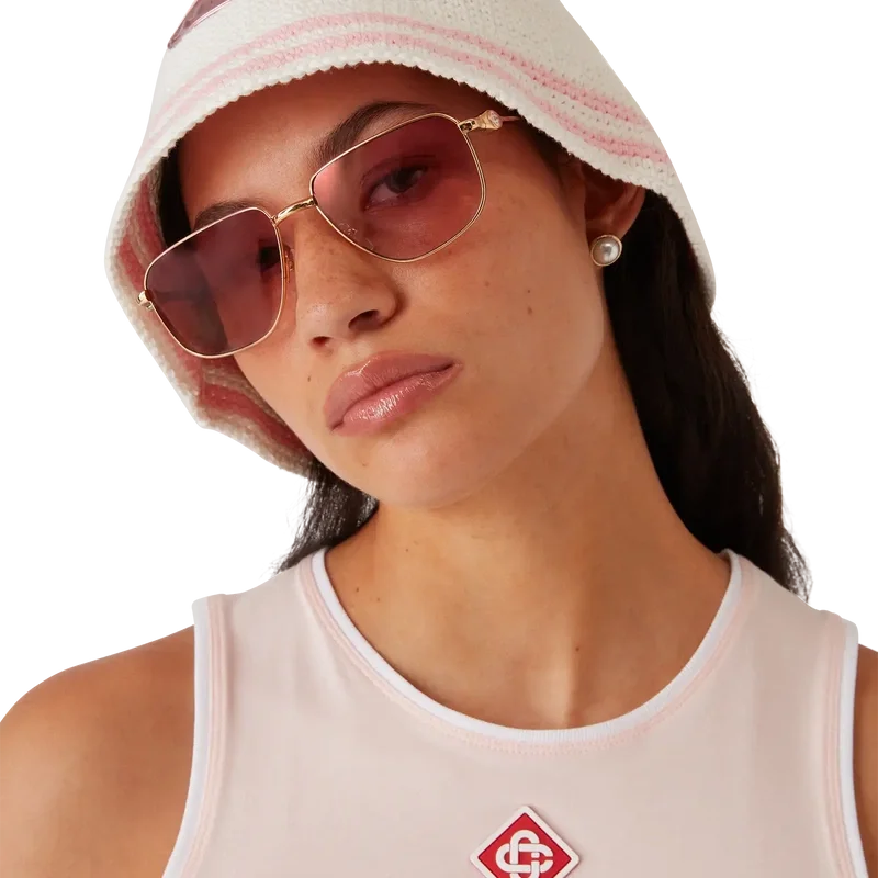 Die Bourgeoisie Girl Häkelmütze hat eine klassische Bucket-Silhouette und verfügt über einen gewebten Casablanca-Logo-Aufnäher, der dem von Sportbekleidung inspirierten Design eine zusätzliche strukturelle Dimension verleiht. Abgerundet durch eine rosa-weiß gestreifte Krempe.
