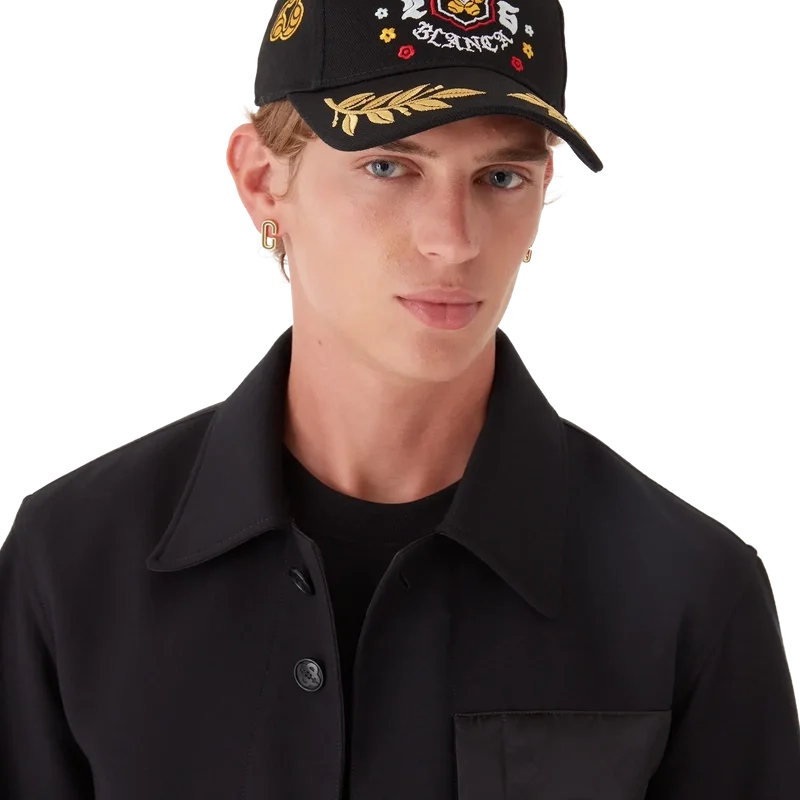 Die BōSōZoku-Kappe mit Lorbeer-Stickerei ist eine klassische Baseballkappe aus Baumwolltwill, die mit dem Artwork dieser Saison verziert ist, für das wir uns von der japanischen Subkultur der BōSōZoku als eines unserer Hauptthemen inspirieren ließen. Der Kontrast zwischen grafischen Elementen und Text wirkte auf uns sehr nach Casablanca. Das Layout ist unkonventionell, aber die Komposition ist sorgfältig ausbalanciert, was ihr ein einzigartiges und dennoch harmonisches Gefühl verleiht. Abgerundet wird sie durch einen Schirm mit goldenem Lorbeerblatt-Detail und einer vergoldeten, verstellbaren Schnalle.