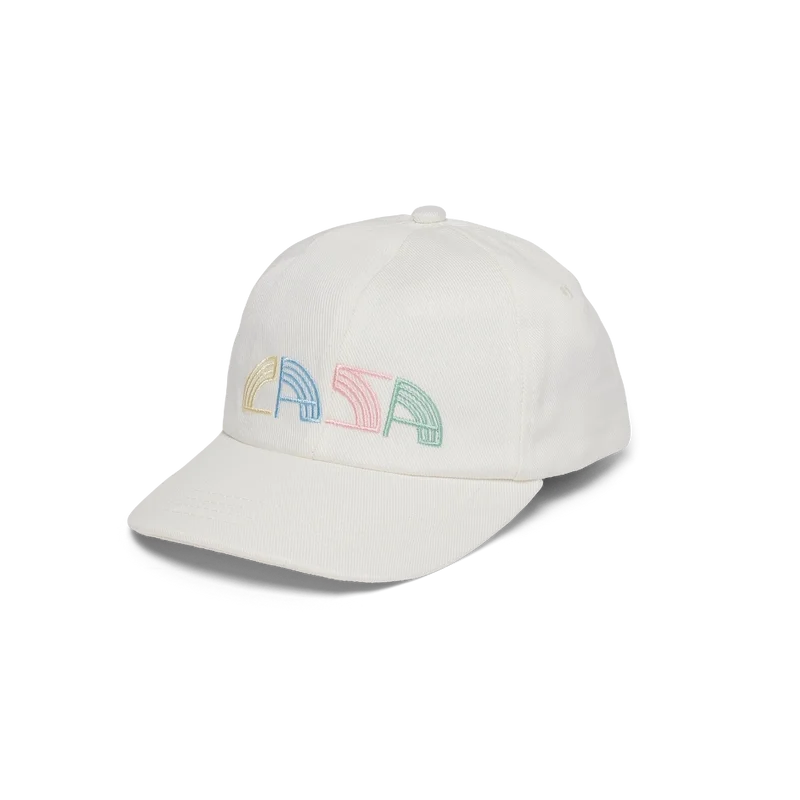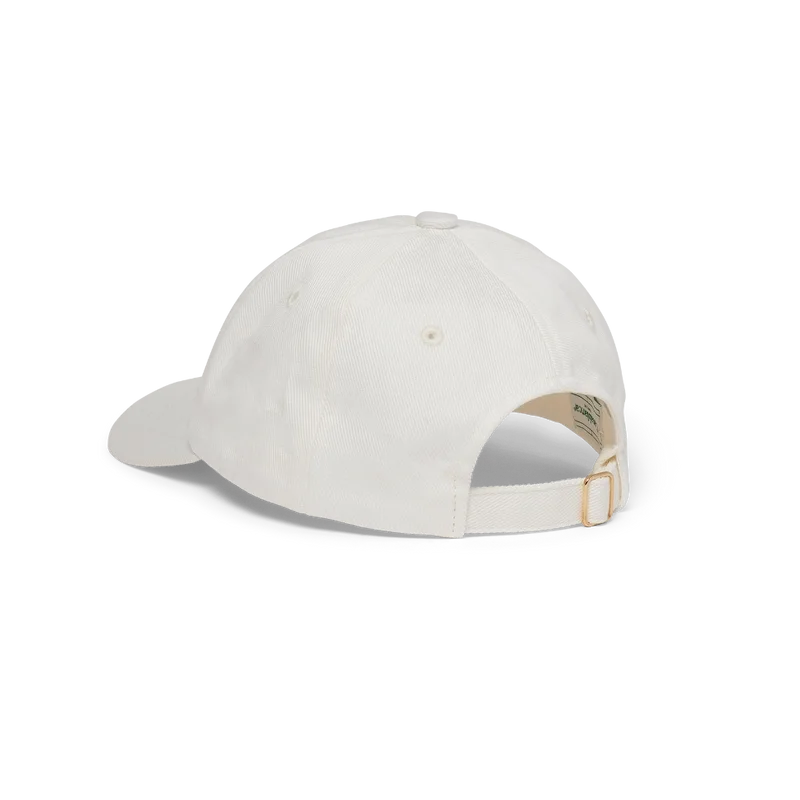Die cremefarbene Casa Deco-Kappe mit Stickerei trägt das duale Branding der Zusammenarbeit. Abgerundet durch einen verstellbaren goldenen Klettverschluss auf der Rückseite.