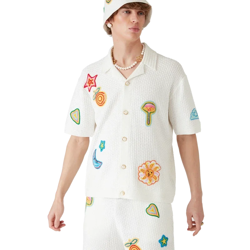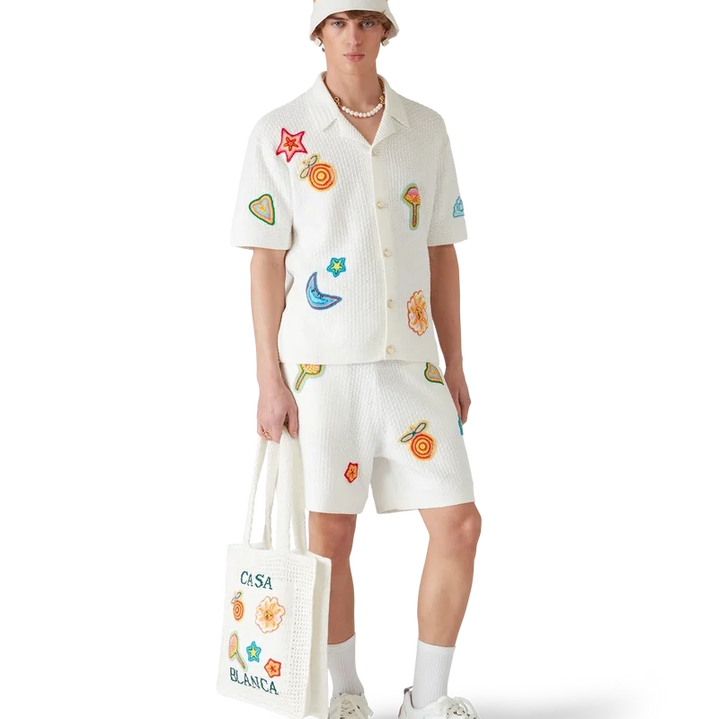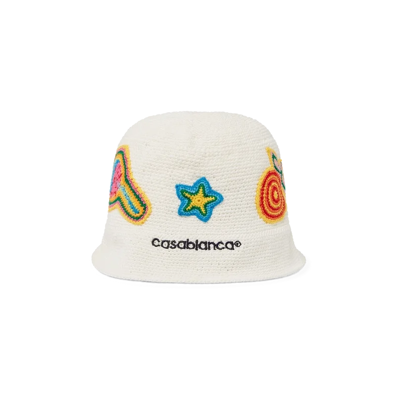 Die Motif-Häkelmütze ist im Bucket-Stil gehalten und aus einem weichen, strukturierten, offen gewebten Baumwoll-Häkelstoff gefertigt – das ultimative Sommer-Must-have. Abgerundet wird sie durch eine Krempe, ein gesticktes Casablanca-Logo und Applikationen der klassischen Designelemente des Hauses in der Mitte.