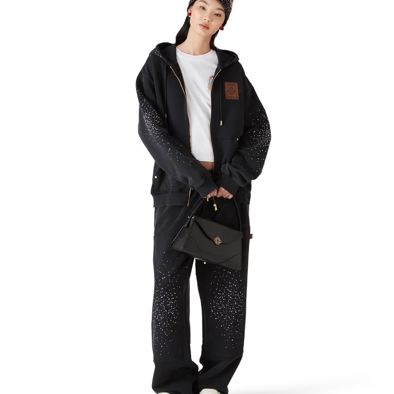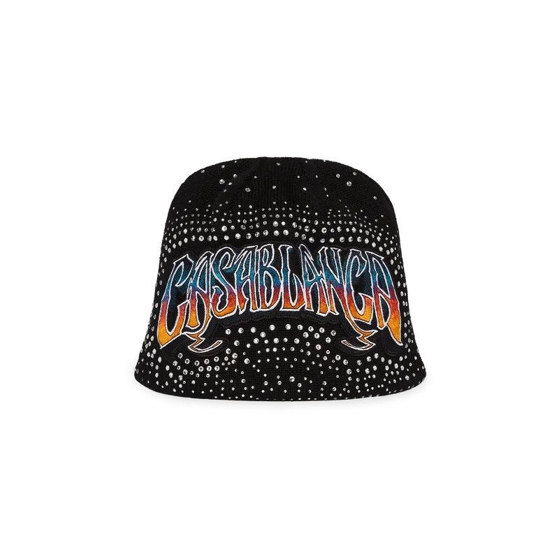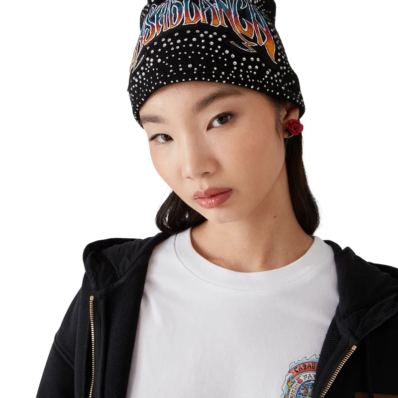 Die Mütze mit gotischen Kristallverzierungen ist ein gewebtes Design aus Wollstoff mit Kristallperlenverzierung. Abgerundet wird sie durch eine gestickte, handgezeichnete Schrift des Casablanca-Logos, inspiriert von der in Tattoos verwendeten gotischen Schriftart.