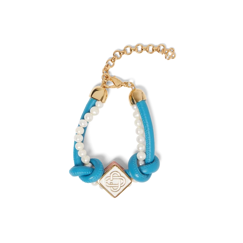 Das blaue Perlenarmband mit Knoten ist aus Leder und Süßwasserperlen gefertigt und mit dem charakteristischen Diamant-Logo des Hauses verziert. Mit vergoldetem Karabinerverschluss und Kette.<!–