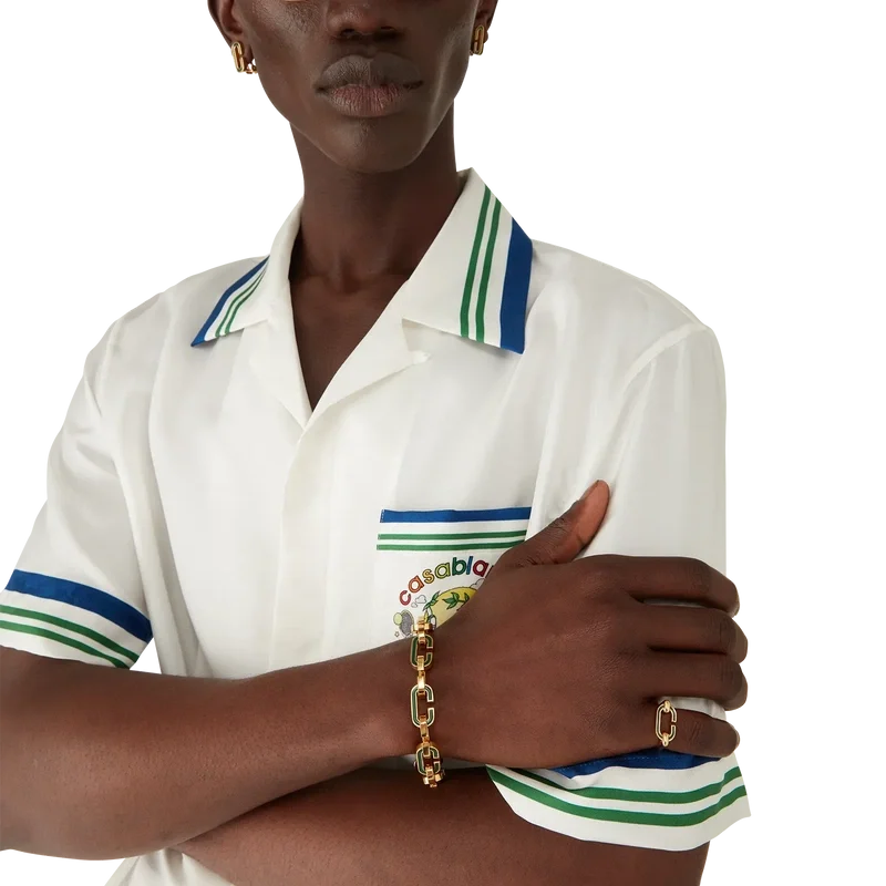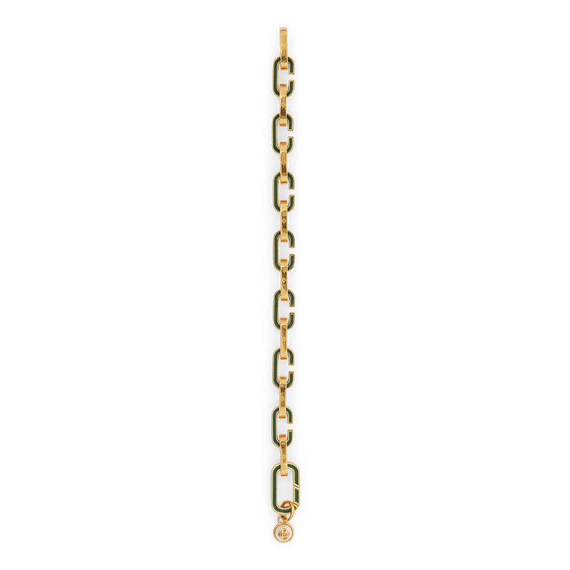 Das „C“-Gliederarmband ist aus vergoldetem Messing und Emaille gefertigt. Abgerundet durch eine vergoldete Kette mit grün handbemalten Emaille-„C“-Gliedern.
