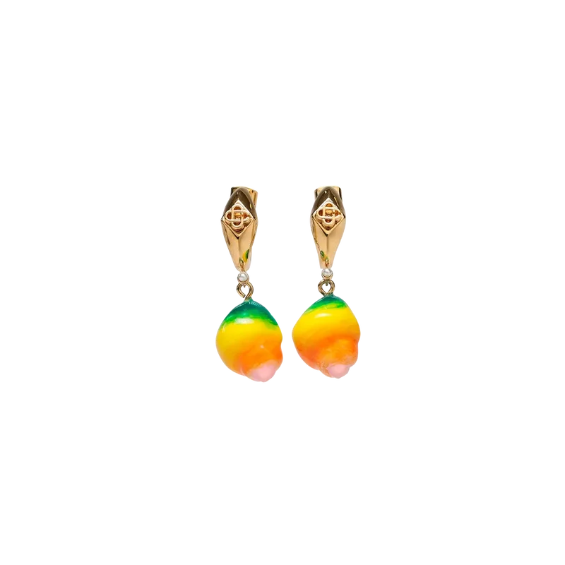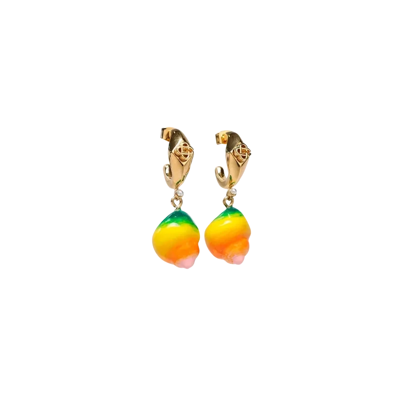 Die Muschel-Ohrringe bestehen aus vergoldeten Messingreifen mit dem ineinander verschlungenen CC-Logo des Hauses und kleinen Muscheln in Regenbogenfarben. Abgerundet durch Glasperlen.