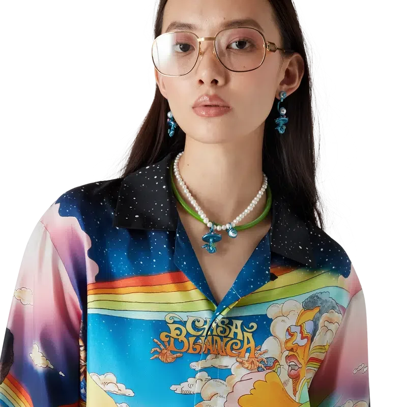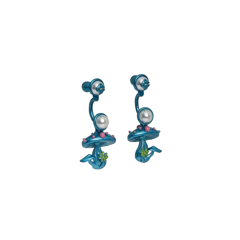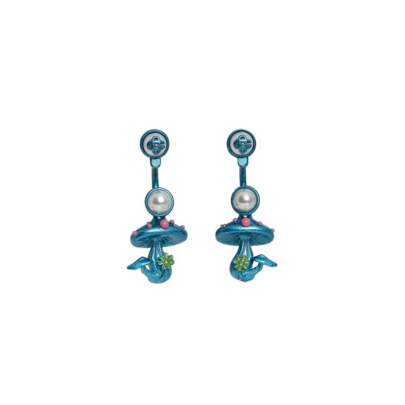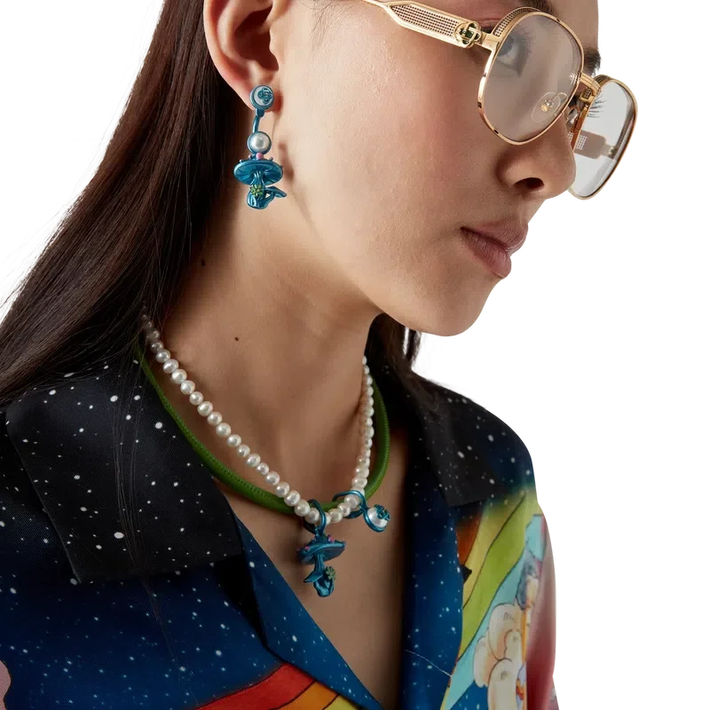Die Pilz-Ohrringe sind ein Paar Ohrhänger für Ohrlöcher, die das klassische Designelement des Hauses – den Pilz – aufgreifen und aus vergoldetem Messing und Kunstglasperlen gefertigt sind.