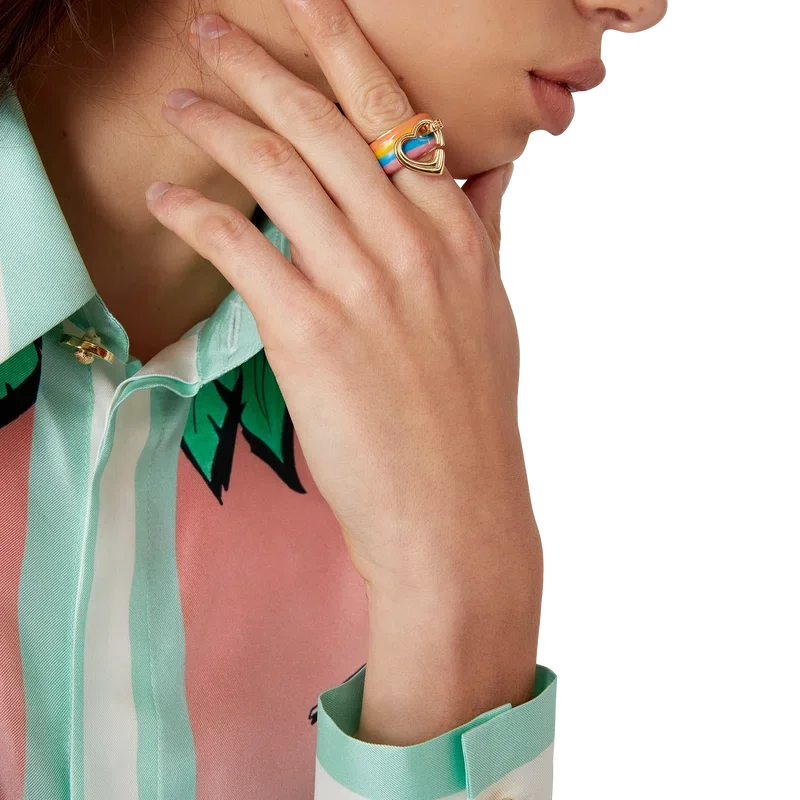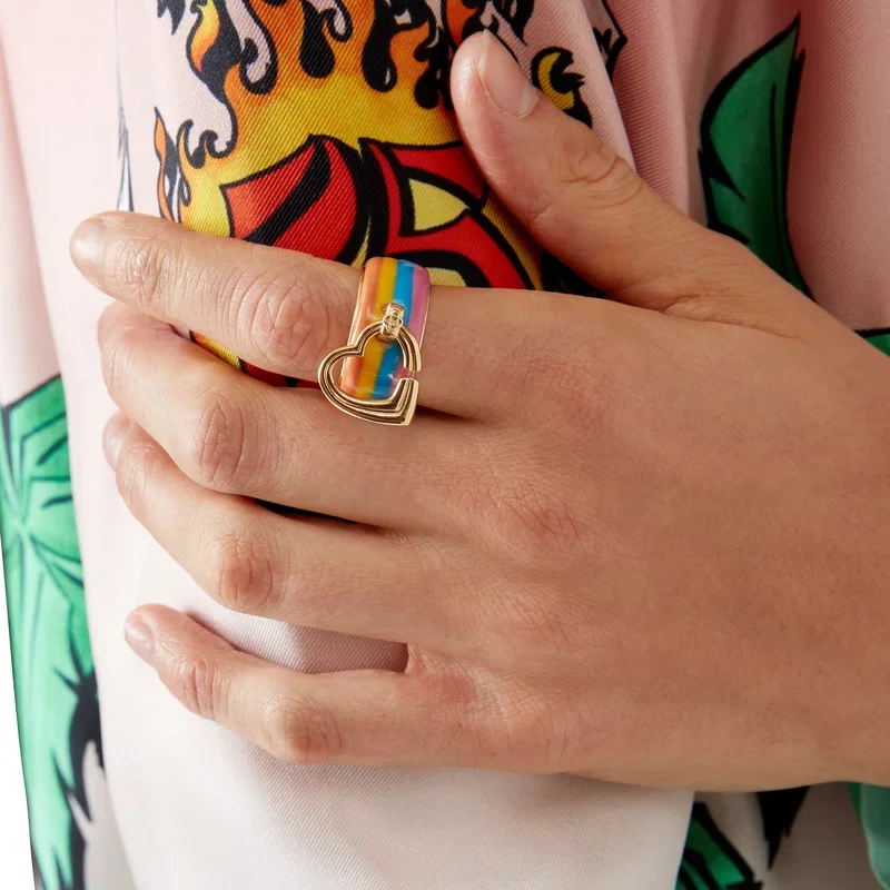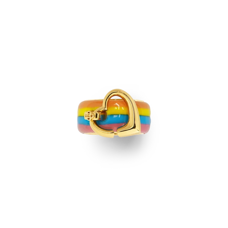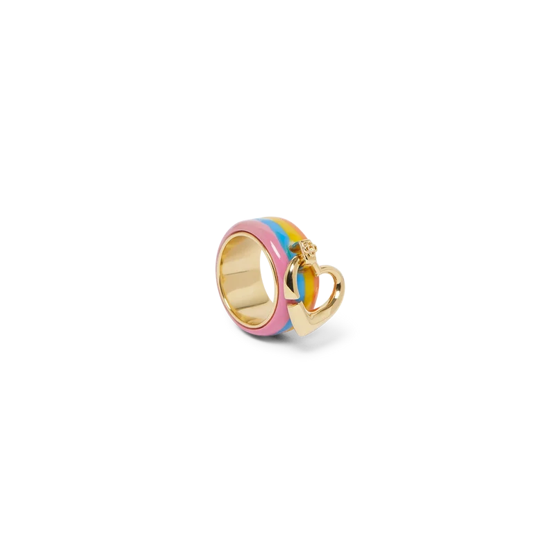 Der Stripe Heart Ring ist aus vergoldetem Messing und Emaille gefertigt. Er besteht aus einem vergoldeten Innenband mit einem äußeren Emaille-Streifen und einem vergoldeten Herz, das von einem vergoldeten Kopf gehalten wird.