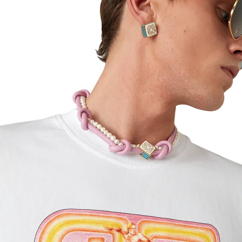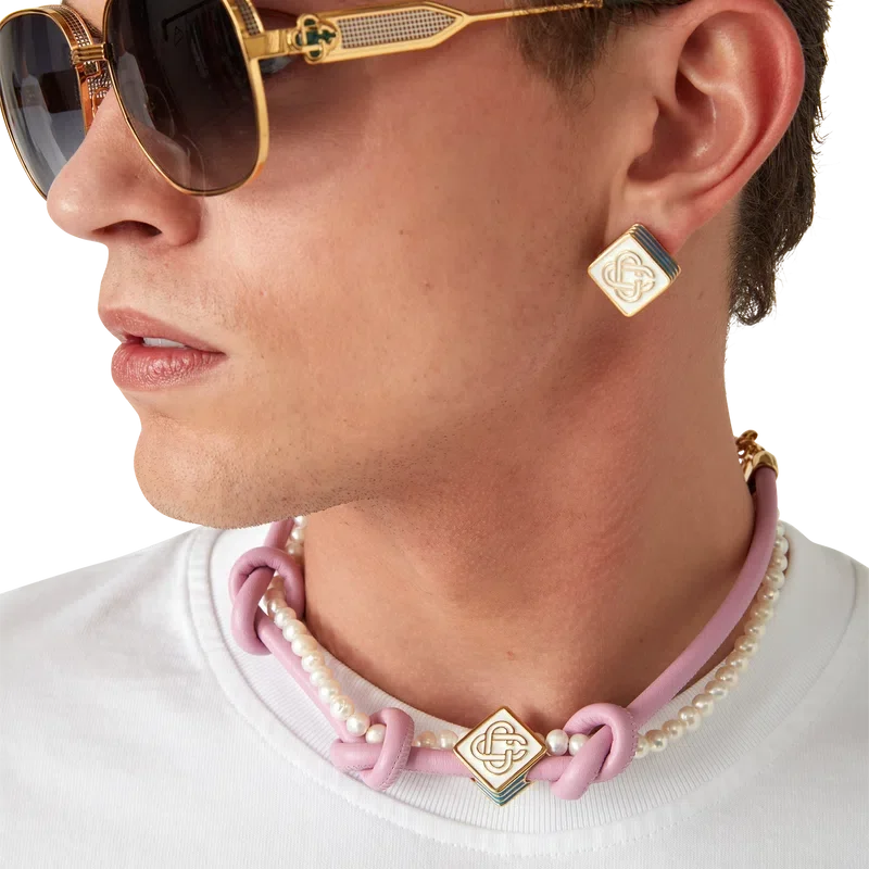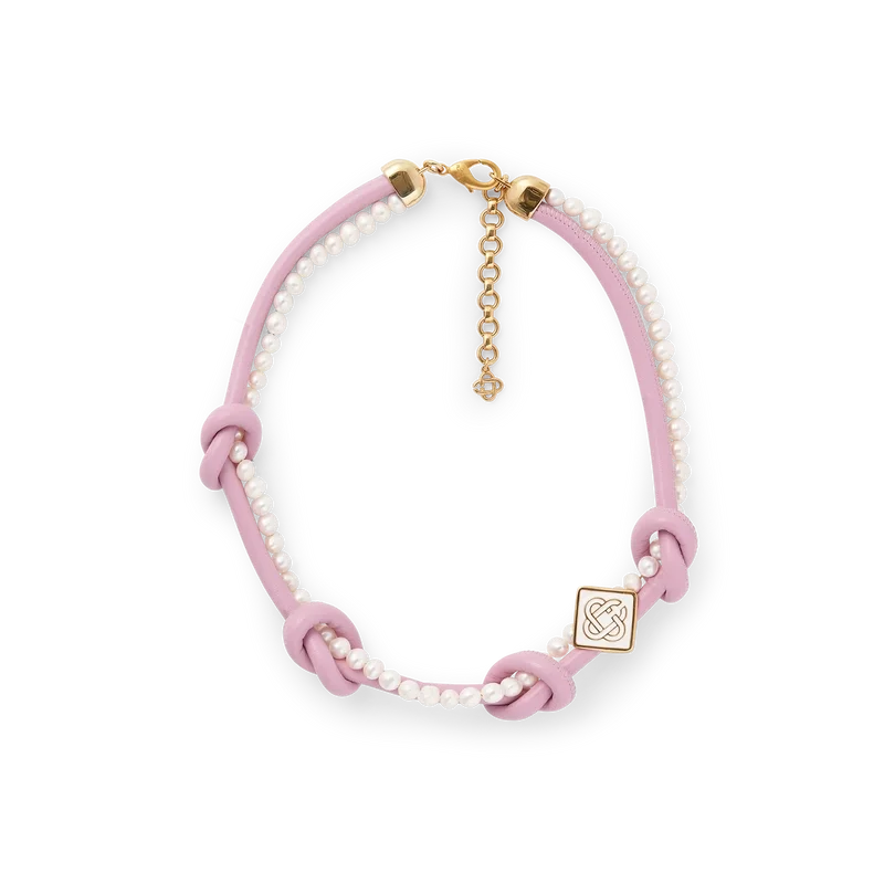 Die rosa geknotete Halskette ist aus Leder und Süßwasserperlen gefertigt und mit dem charakteristischen Diamant-Logo des Hauses verziert. Mit vergoldetem Karabinerverschluss und Kette.<!–