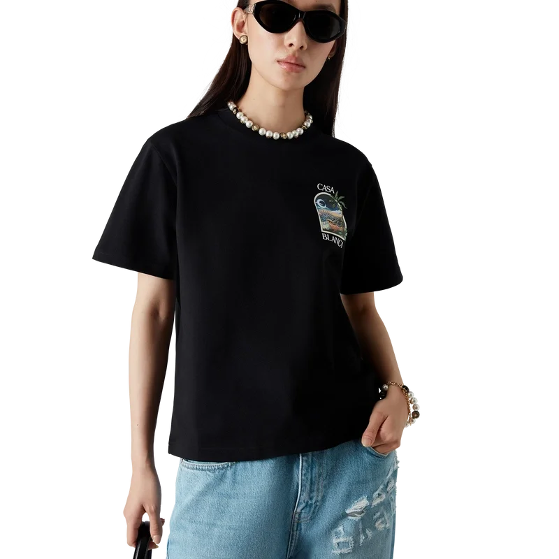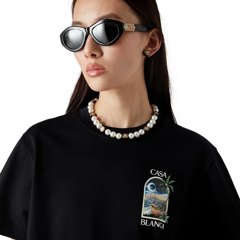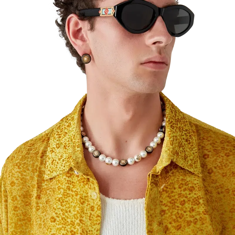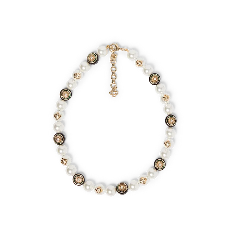 Die Spoke Wheel Halskette ist aus vergoldetem Messing, Emaille und Süßwasserperlen gefertigt. Mit dem ineinander verschlungenen CC-Logo des Hauses, einer vergoldeten Kette und einem Karabinerverschluss.