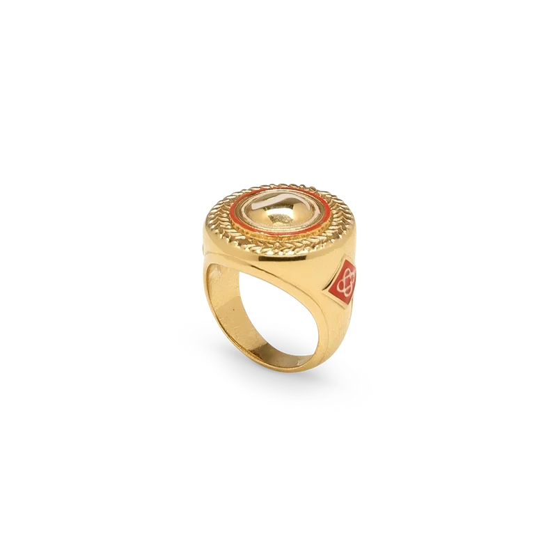 Der Sport-Medaillon-Ring ist aus vergoldetem Messing und Emaille gefertigt und ziert auf dem Ringband das charakteristische Diamant-Logo des Hauses.