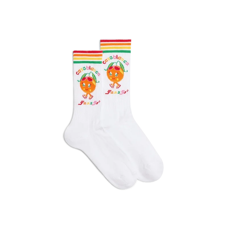 Die Kawaii Orange Socken sind weiße Sportsocken aus einem Baumwollmischgewebe und zeigen das saisonale Motiv dieser Figur, die als Orange gestaltet ist – eine weitere Schlüsselfigur in unserem Universum, ausgestattet mit Casa-Accessoires, Brille und Sneakers. Abgerundet durch gerippte Bündchen und grün-gelb-orange-rot-weiße Streifen an den Sockenenden.
