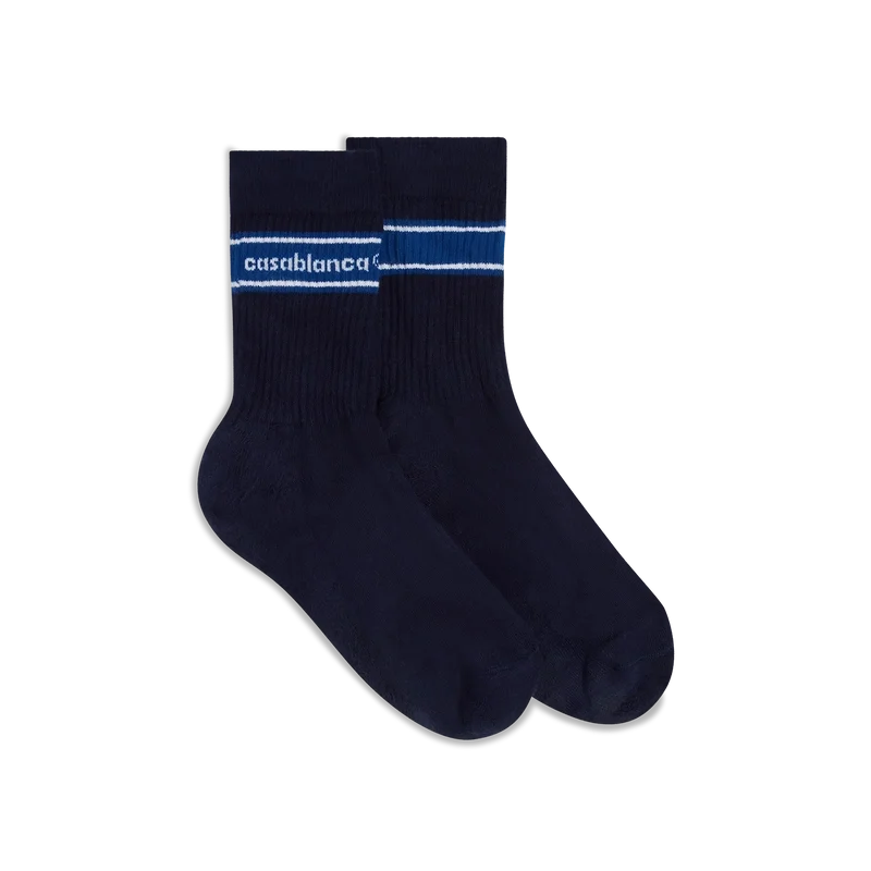Die Sporty Stripe Socken sind ein raffiniertes Design mit Streifen-Details. Dieses Modell verkörpert die Apras-Sport-Ästhetik des Hauses mit raffinierten sportlichen Elementen. Abgerundet durch gerippte Bündchen und ein kontrastierendes Casablanca-Logo an den Sockenenden.